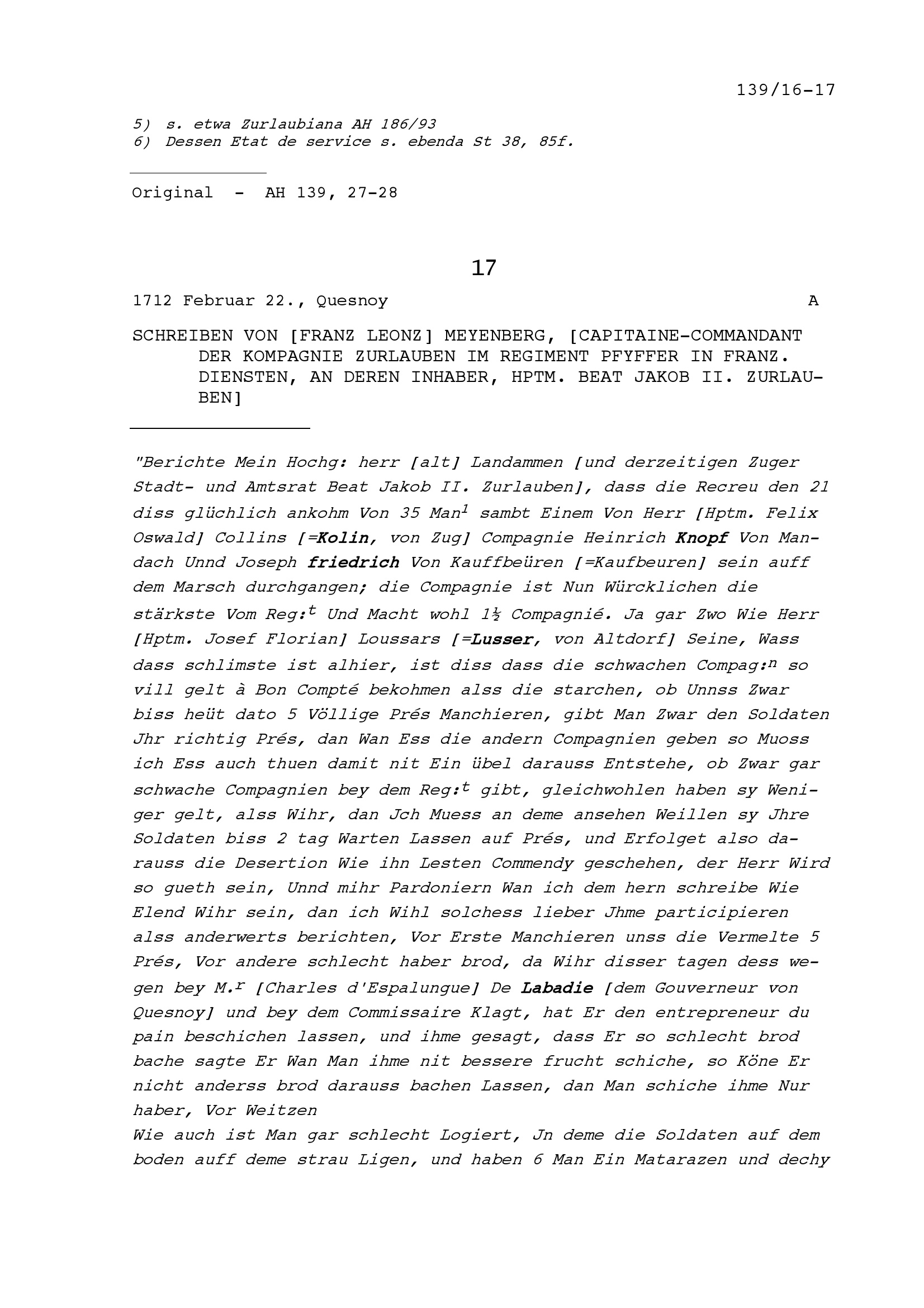 Schreiben von NN Stürler, von Bern oder Solothurn, an Beat Fidel Zurlauben, Gardehauptmann