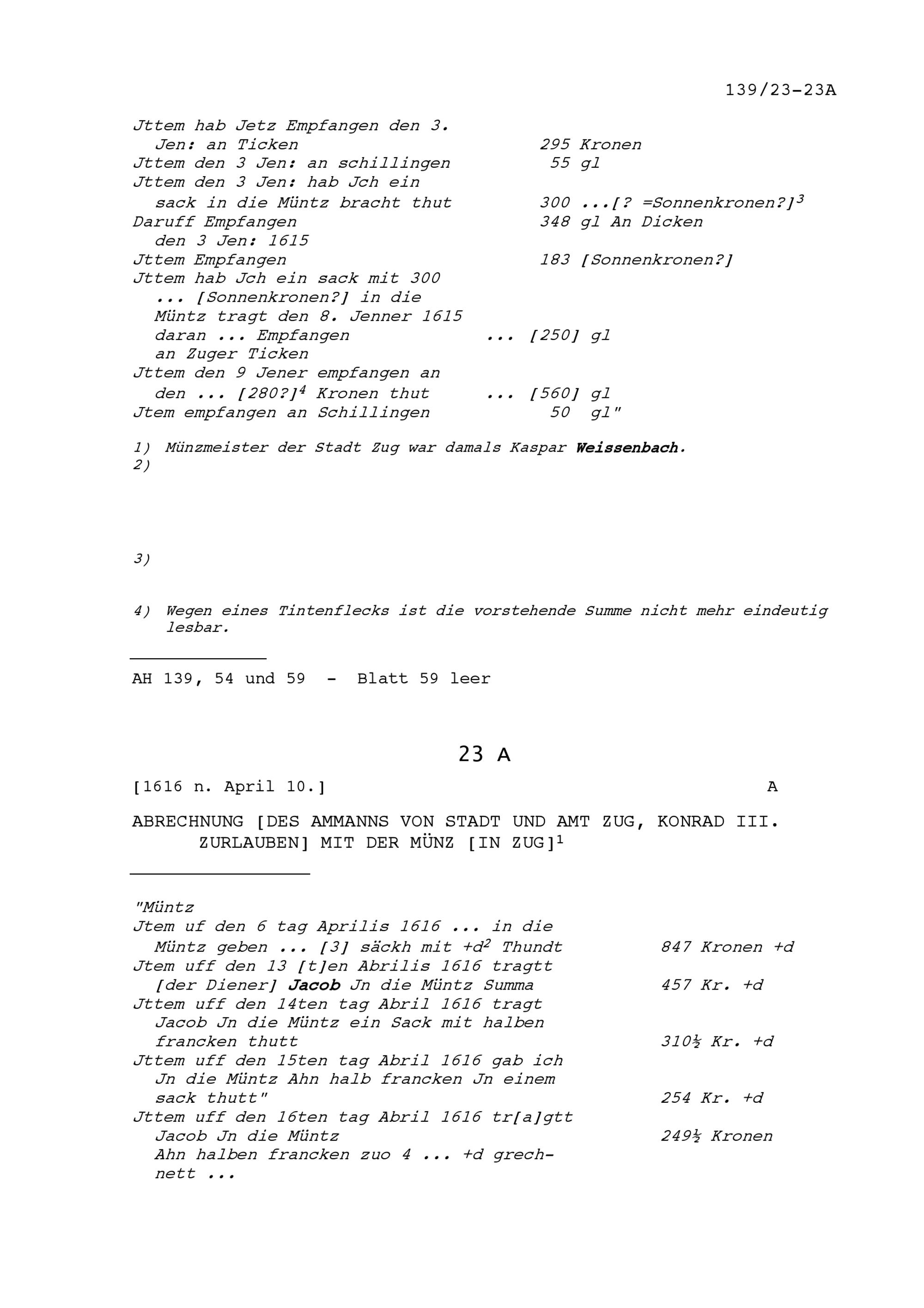 Abrechnung von Konrad III. Zurlauben, Ammann von Stadt und Amt Zug, mit der Münz in Zug