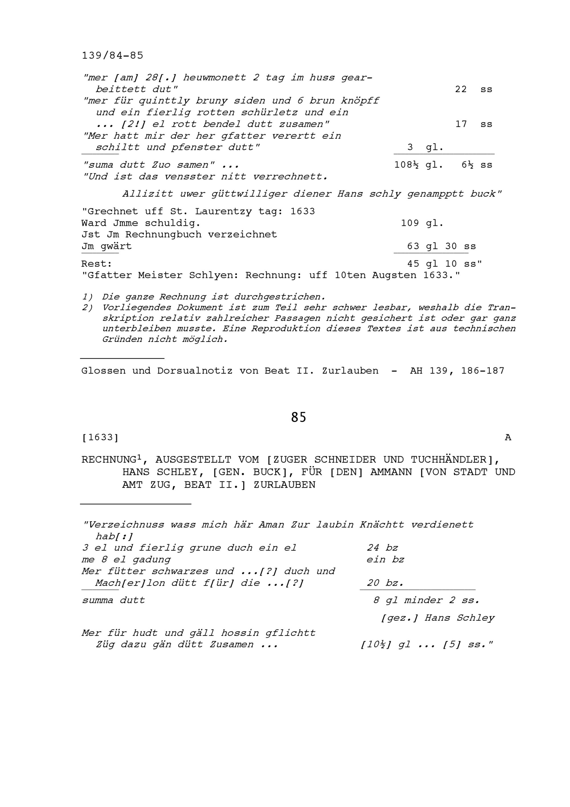 Rechnung für Beat II. Zurlauben, Ammann von Stadt und Amt Zug, ausgestellt von Hans Schley, genannt Buck, Zuger Schneider und Tuchhändler