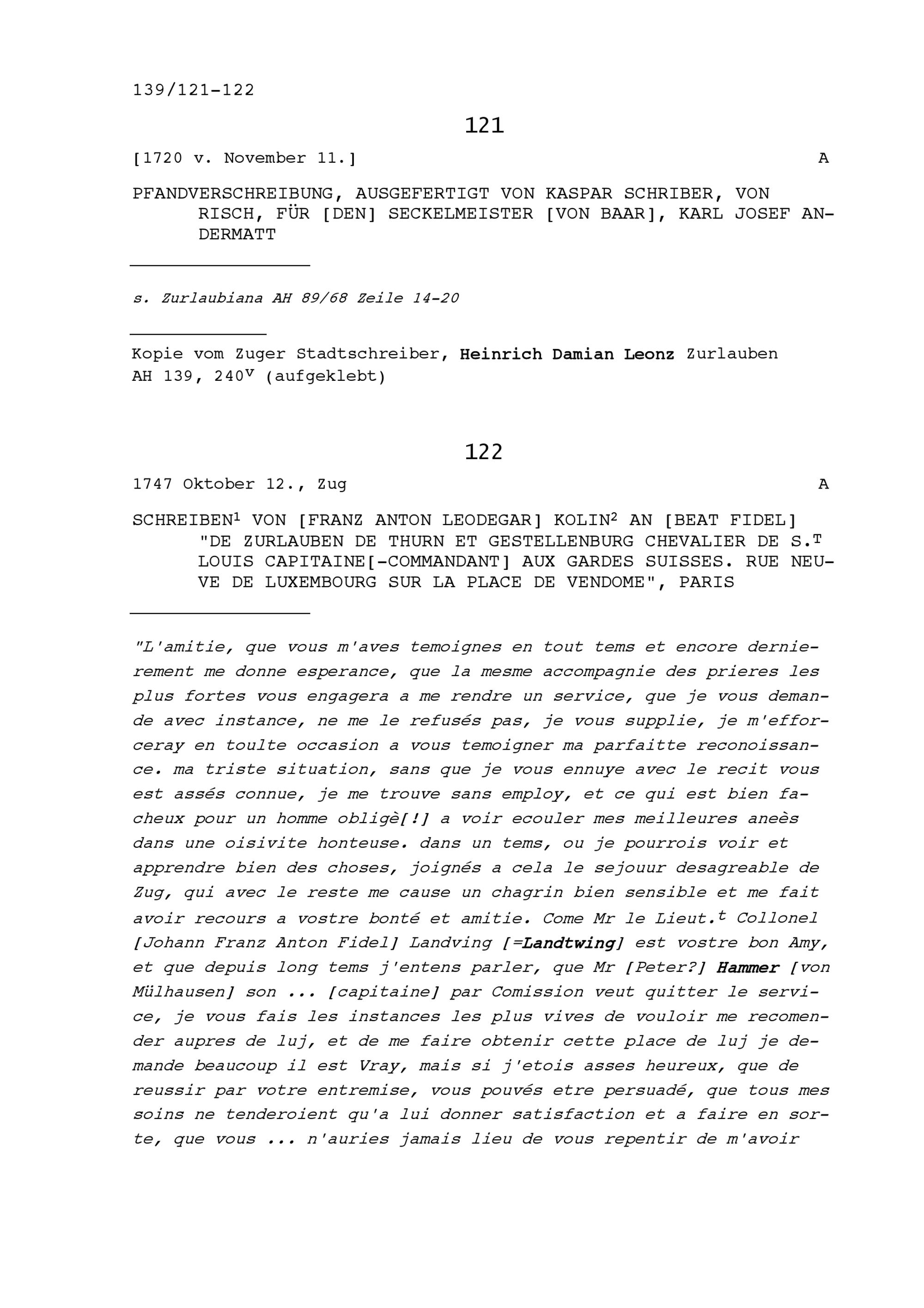 Schreiben von Franz Anton Leodegar Kolin an Beat Fidel Zurlauben, Kommandant der Schweizer Garden, Paris