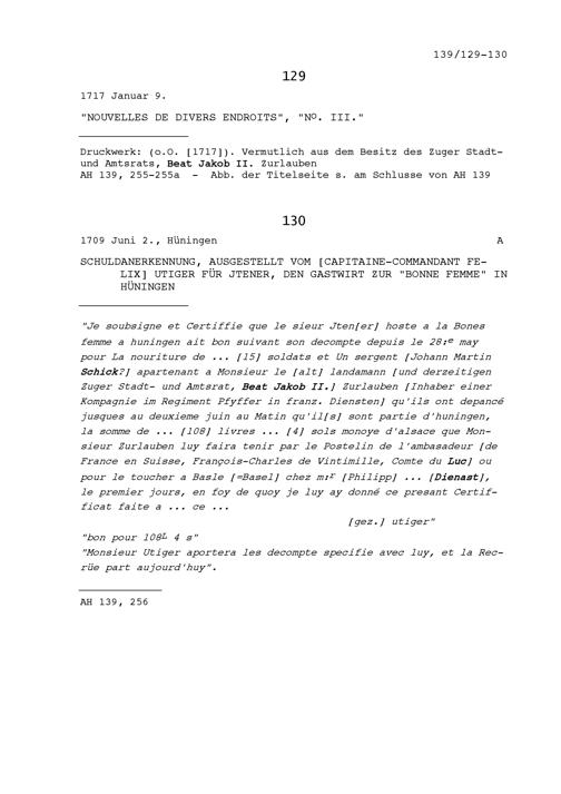 Schuldanerkennung für NN Itener, Gastwirt zur Bonne Femme in Hüningen, ausgestellt von Felix Utiger, Kommandant