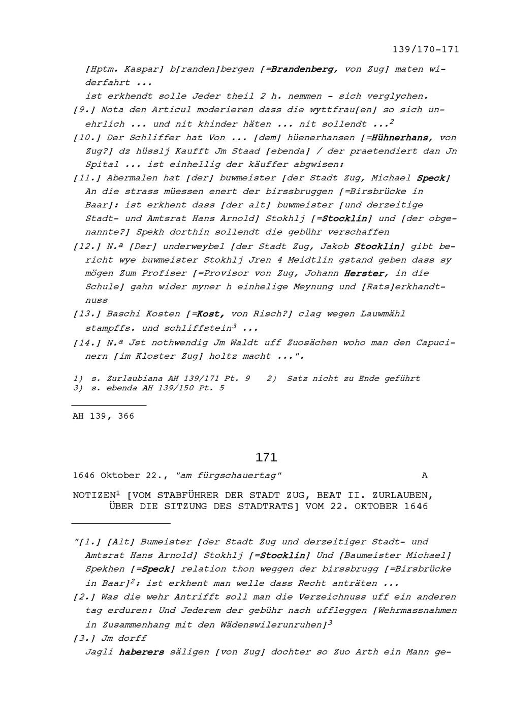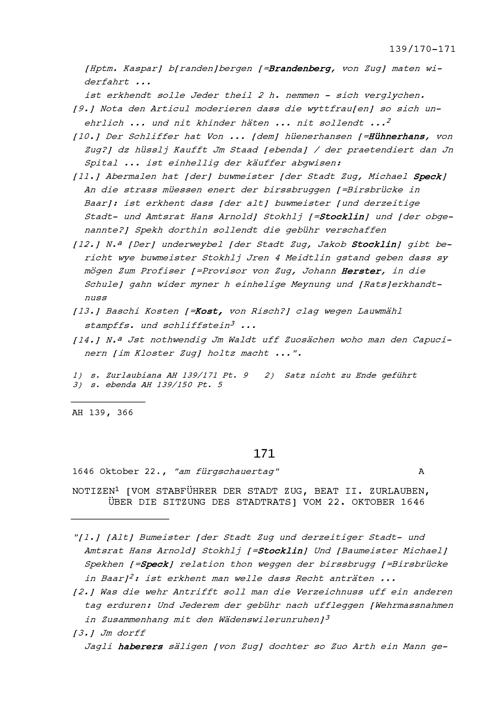 Notiz von Beat II. Zurlauben, Stabführer der Stadt Zug, über die Sitzung des Stadtrats vom 20. Oktober 1646