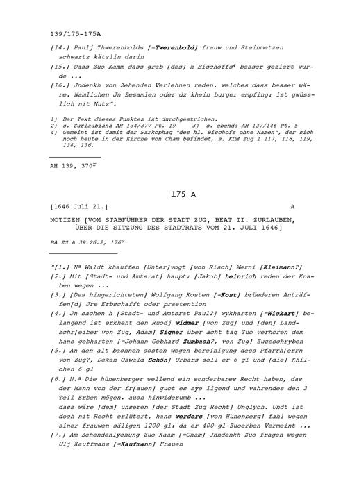 Notiz von Beat II. Zurlauben, Stabführer der Stadt Zug, über die Sitzung des Stadtrats vom 7. Juli 1646