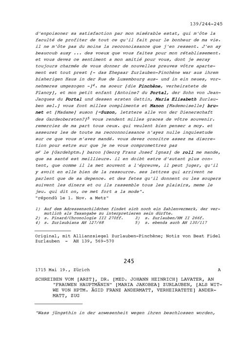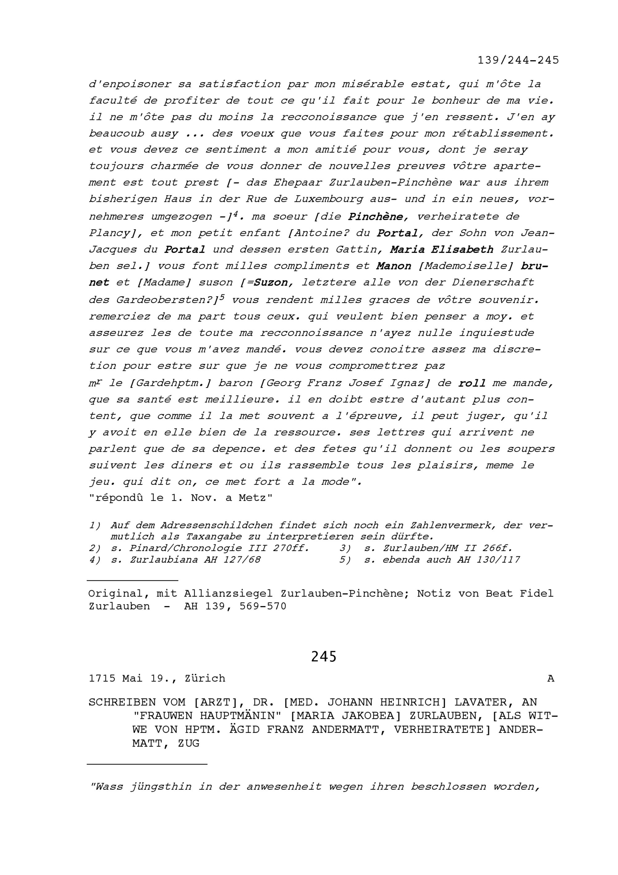 Schreiben von Marie-Florimonde de Pinchène an Beat Fidel Zurlauben, Leutnant in der Kompanie von Louis-Auguste de Bourbon, Prince de Dombes, Generaloberst der Schweizer und Bündner