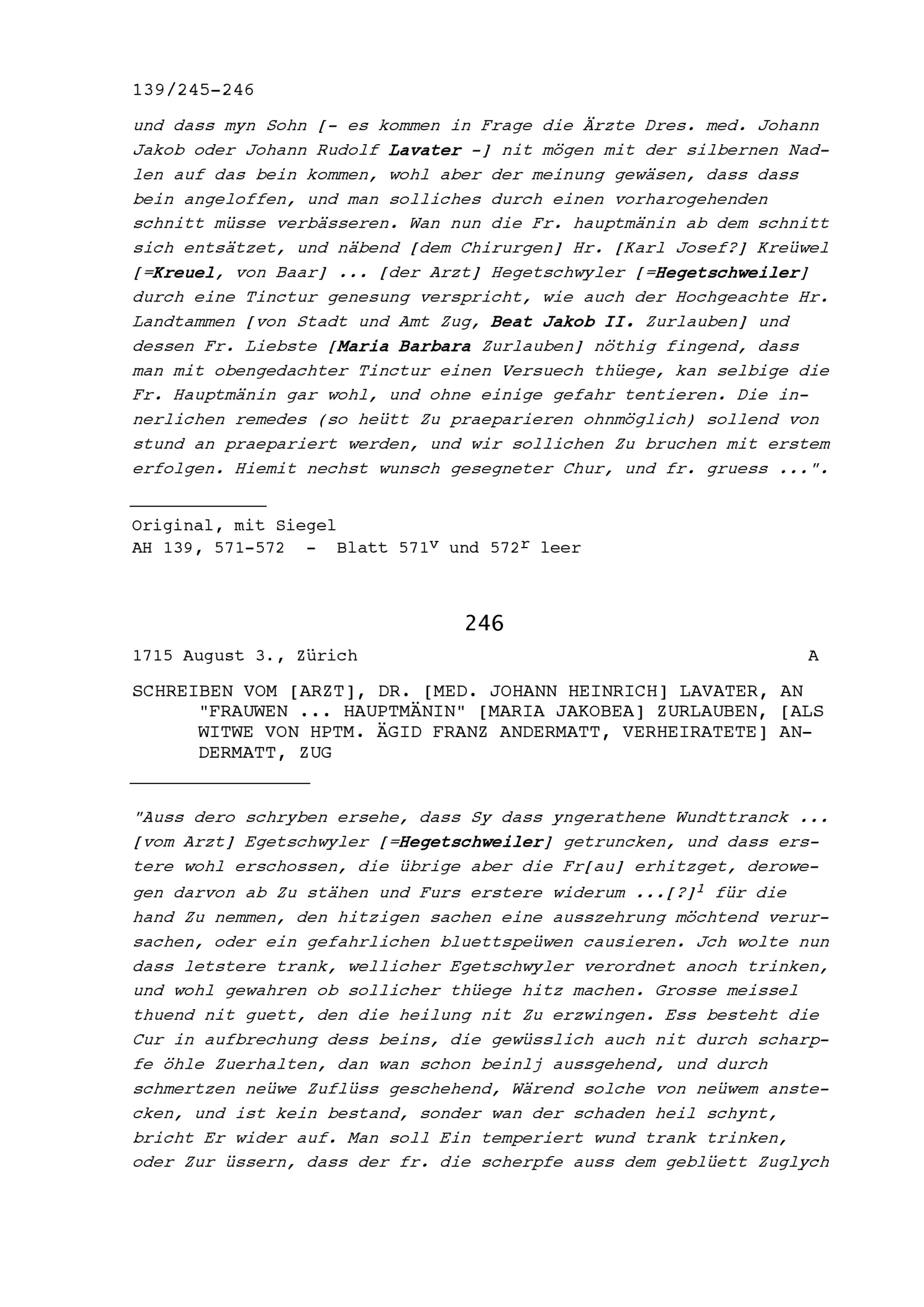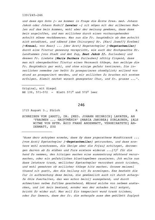 Schreiben von Johann Heinrich Lavater, Dr. med., an Maria Jakobea Zurlauben, Witwe von Ägid Franz Andermatt, Hauptmann, Zug