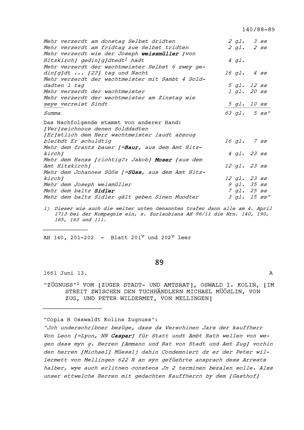 Abrechnung von Heinrich Rey, Wachtmeister, Hämikon, für Zehrgeld und Werbung für Beat Jakob II. Zurlauben, Altlandammann und Hauptmann, Inhaber einer Kompanie im Regiment Pfyffer in französischen Diensten