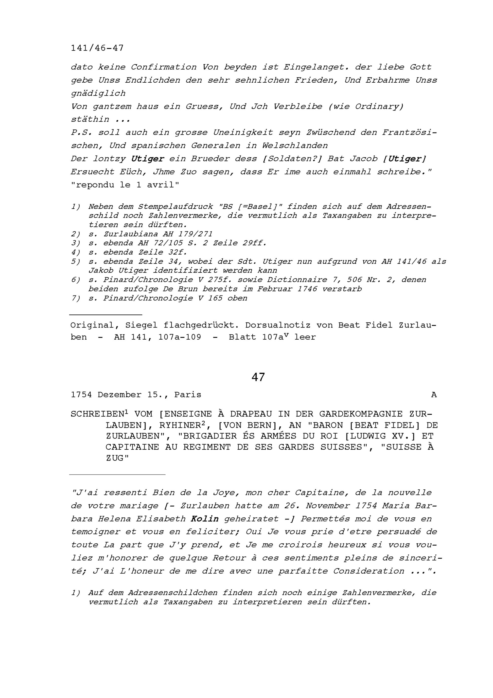Schreiben von Beat Jakob Anton Zurlauben, Priester, an Beat Fidel Zurlauben, Hauptmann im Regiment von Beat Franz Plazidus Zurlauben, Paris