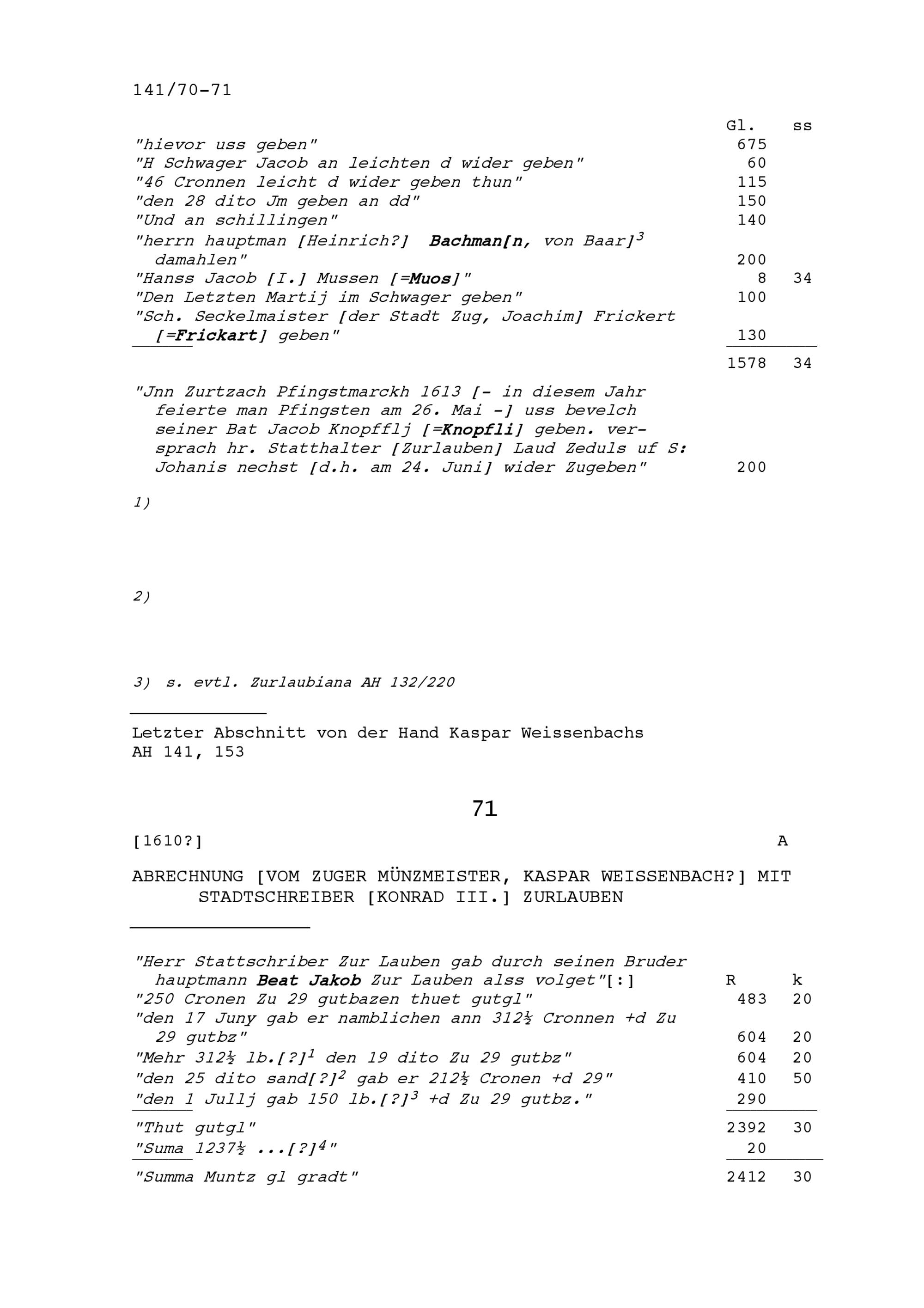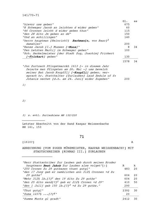 Abrechnung von Kaspar Weissenbach, Zuger Münzmeister, mit Konrad III. Zurlauben, Statthalter von Stadt und Amt Zug