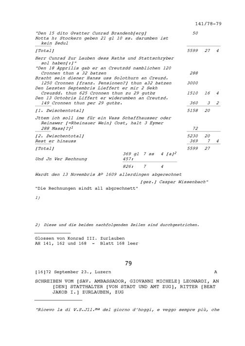 Abrechnung von Kaspar Weissenbach, Zuger Münzmeister, mit Konrad III. Zurlauben, Stadtschreiber und Stadt- und Amtrat