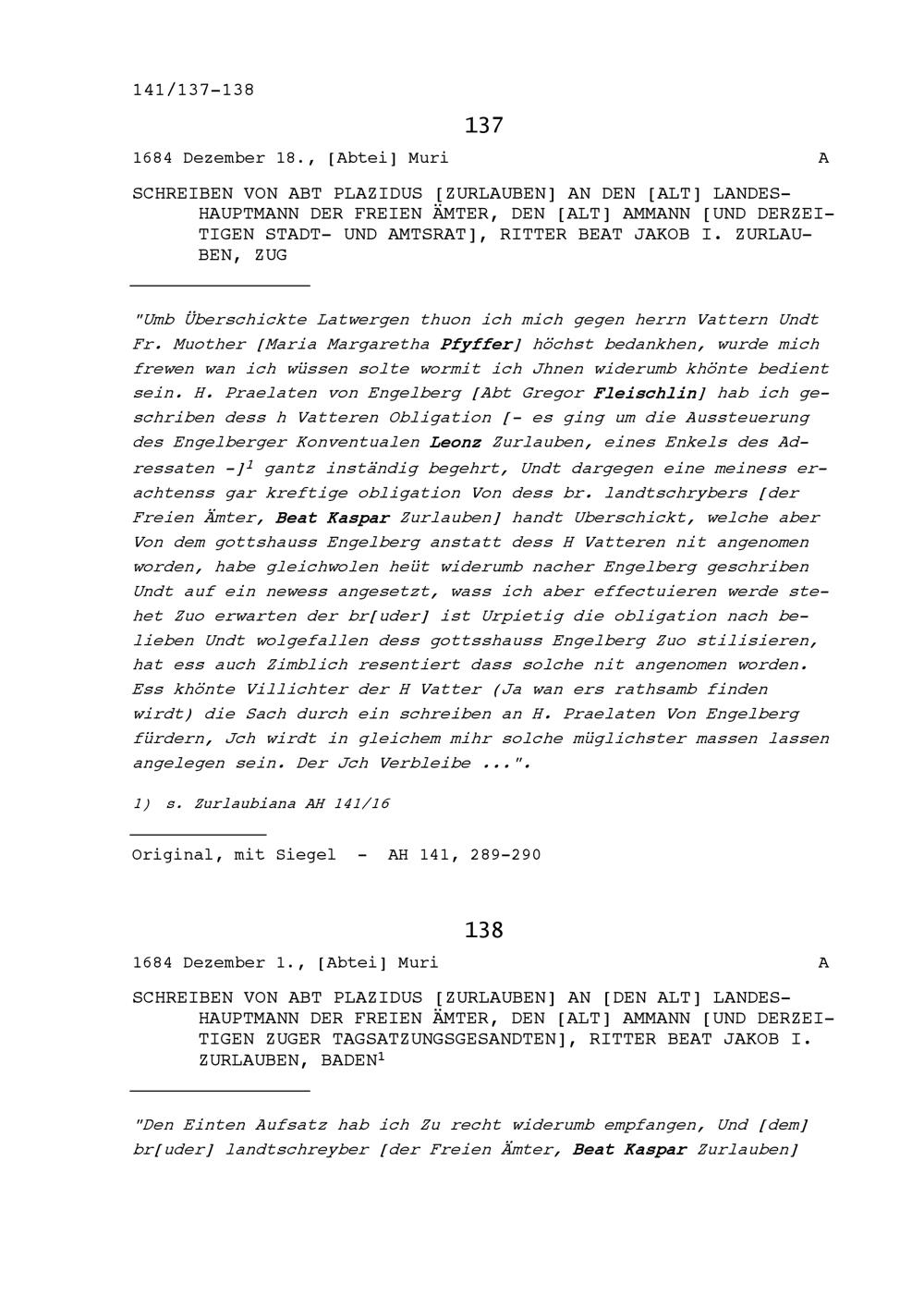 Schreiben von Plazidus Zurlauben, Abt, an Jakob I. Zurlauben, Altlandeshauptmann...