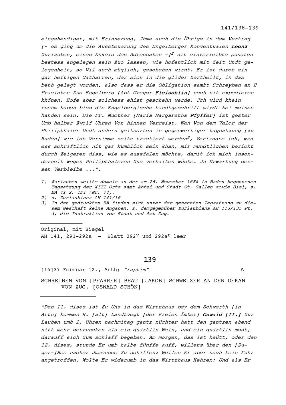 Schreiben von Plazidus Zurlauben, Abt, an Jakob I. Zurlauben, Altlandeshauptmann...