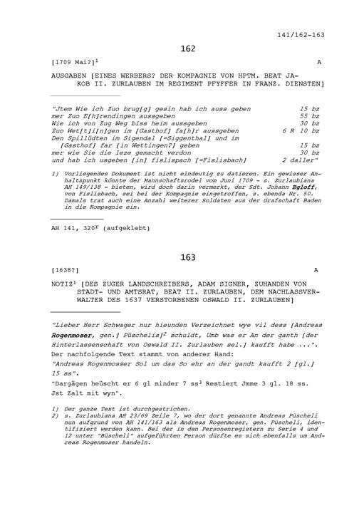 Notiz von Adam Signer, Zuger Landschreiber, zuhanden von Beat II. Zurlauben, Stadt-...
