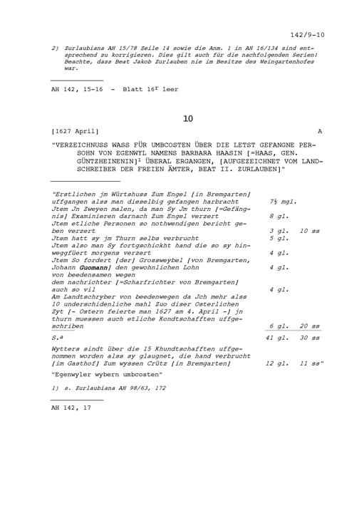 Abrechnung von Beat II. Zurlauben, Landschreiber der Freien Ämter, mit Barbara Muos, Wirtin zum Ochsen in Zug