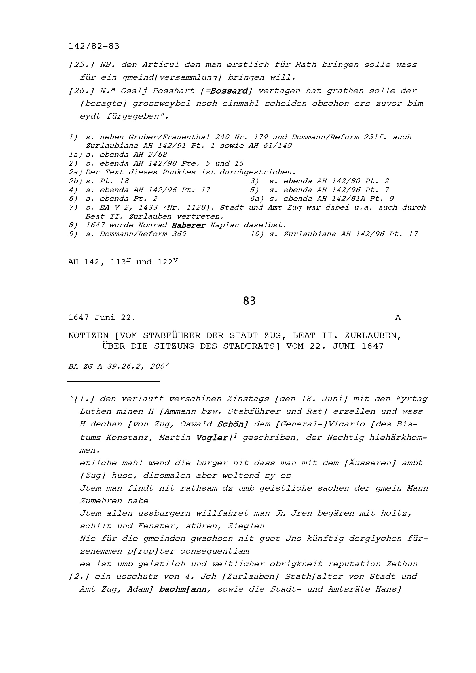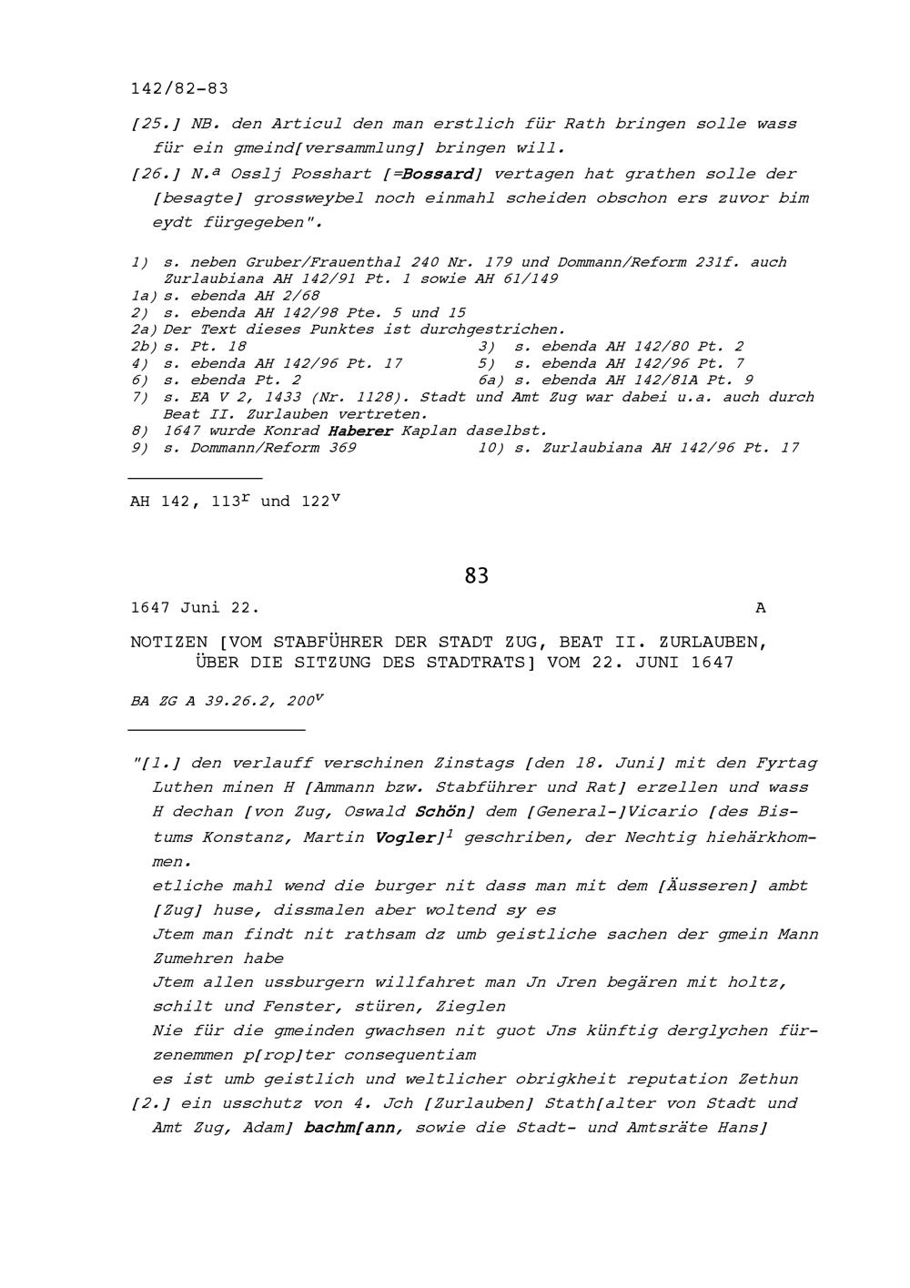 Notiz von Beat II. Zurlauben, Stabführer der Stadt Zug, über die Sitzung des Stadtrats vom 15. Juni 1647