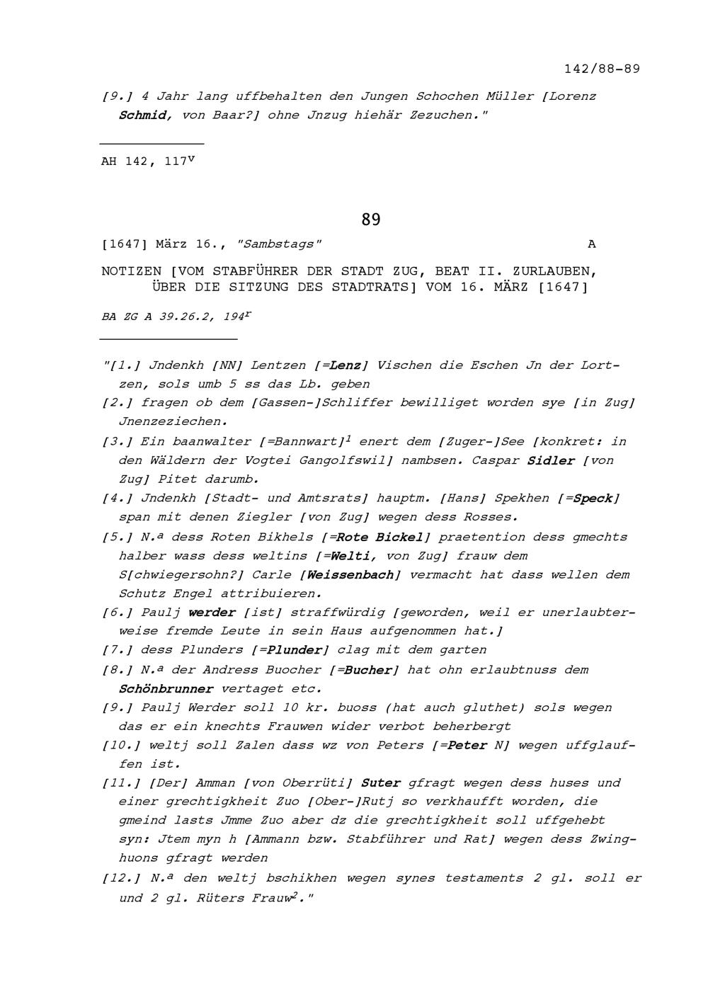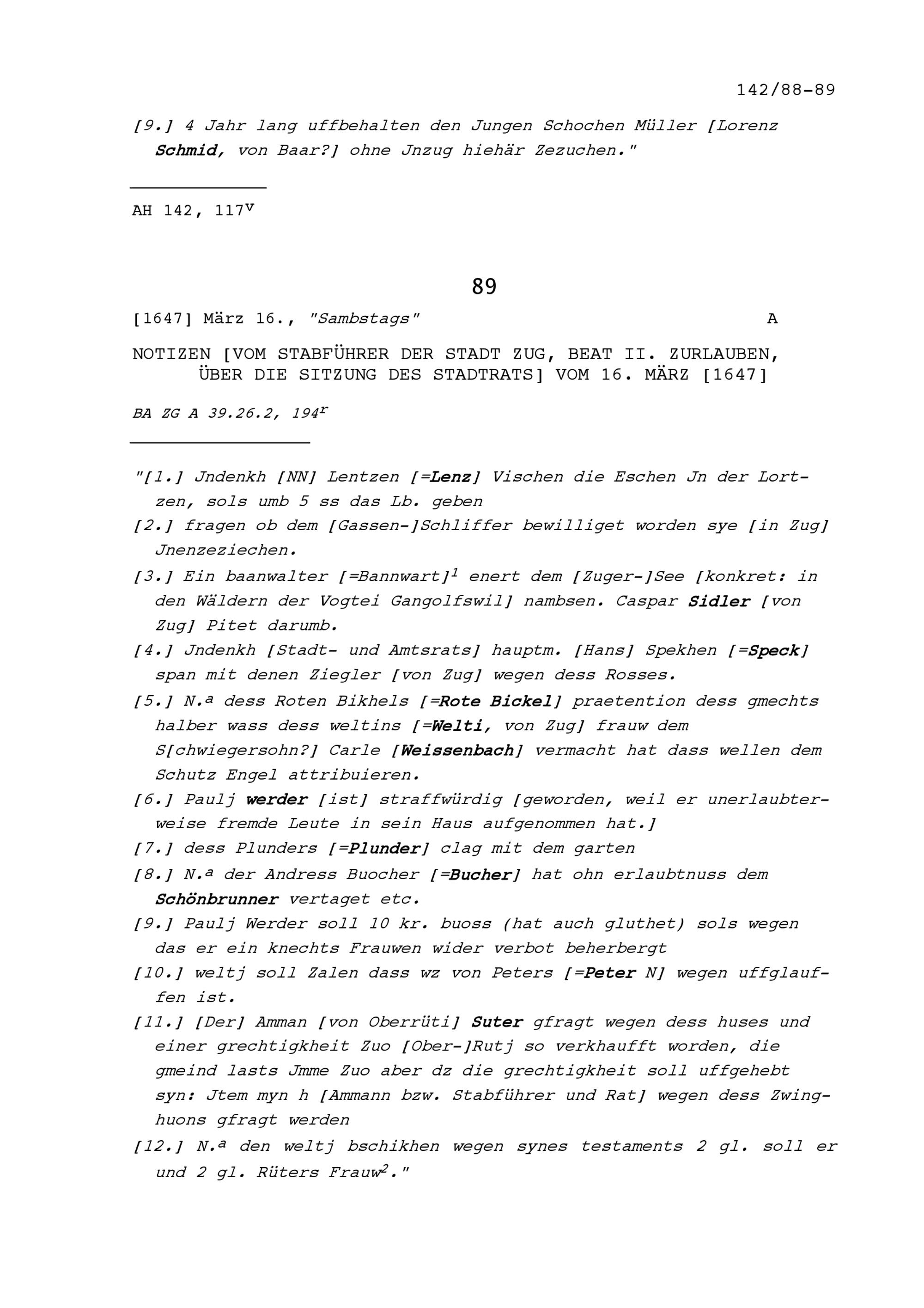 Notiz von Beat II. Zurlauben, Stabführer der Stadt Zug, über die Sitzung des Stadtrats vom 9. März 1647