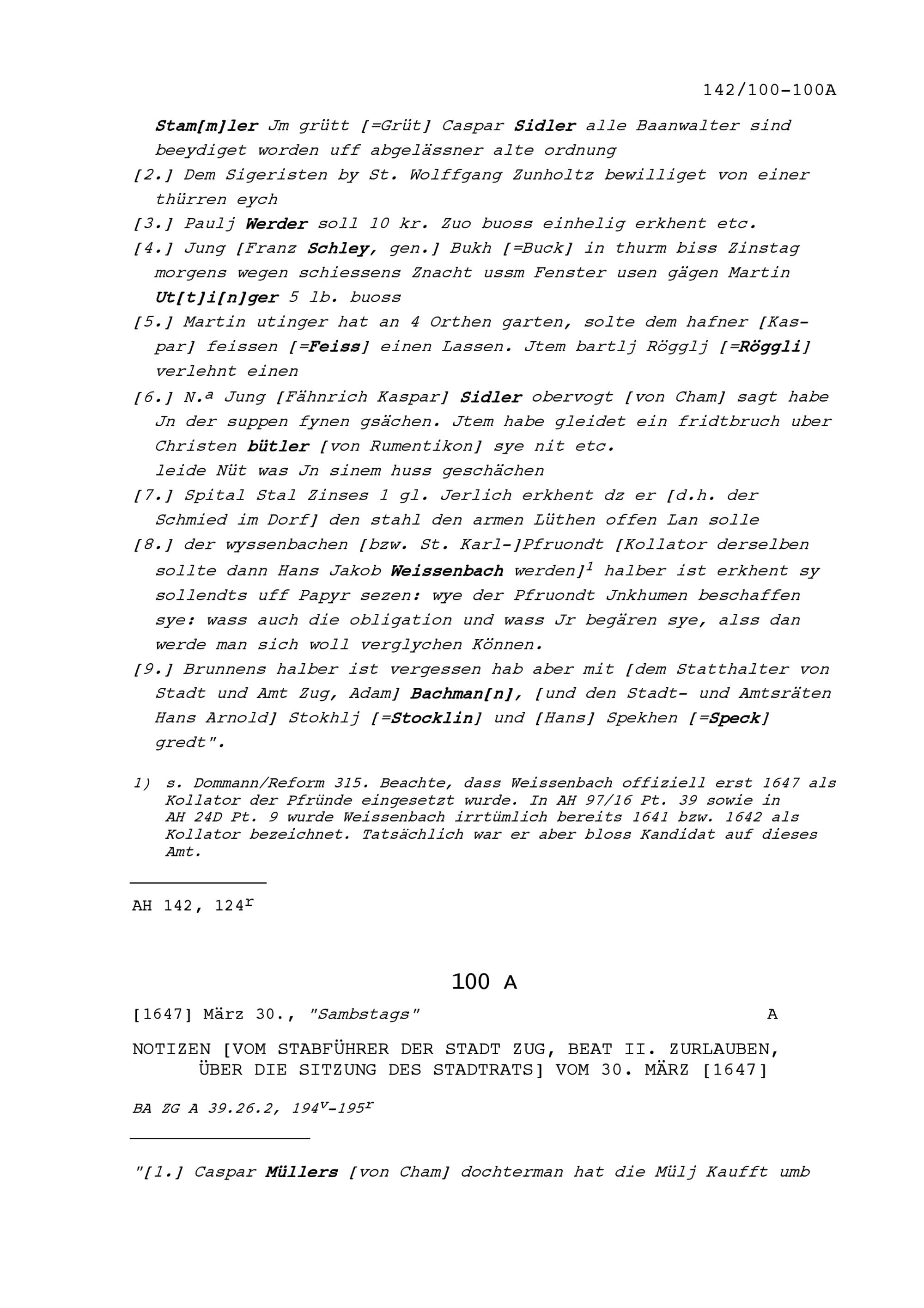 Notiz von Beat II. Zurlauben, Stabführer der Stadt Zug, über die Sitzung des Stadtrats vom 23. März 1647