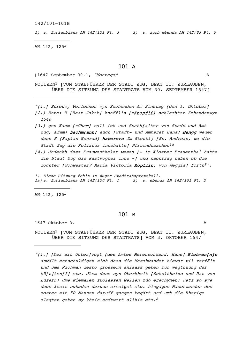 Notiz von Beat II. Zurlauben, Stabführer der Stadt Zug, über die Sitzung des Stadtrats vom 28. September 1647