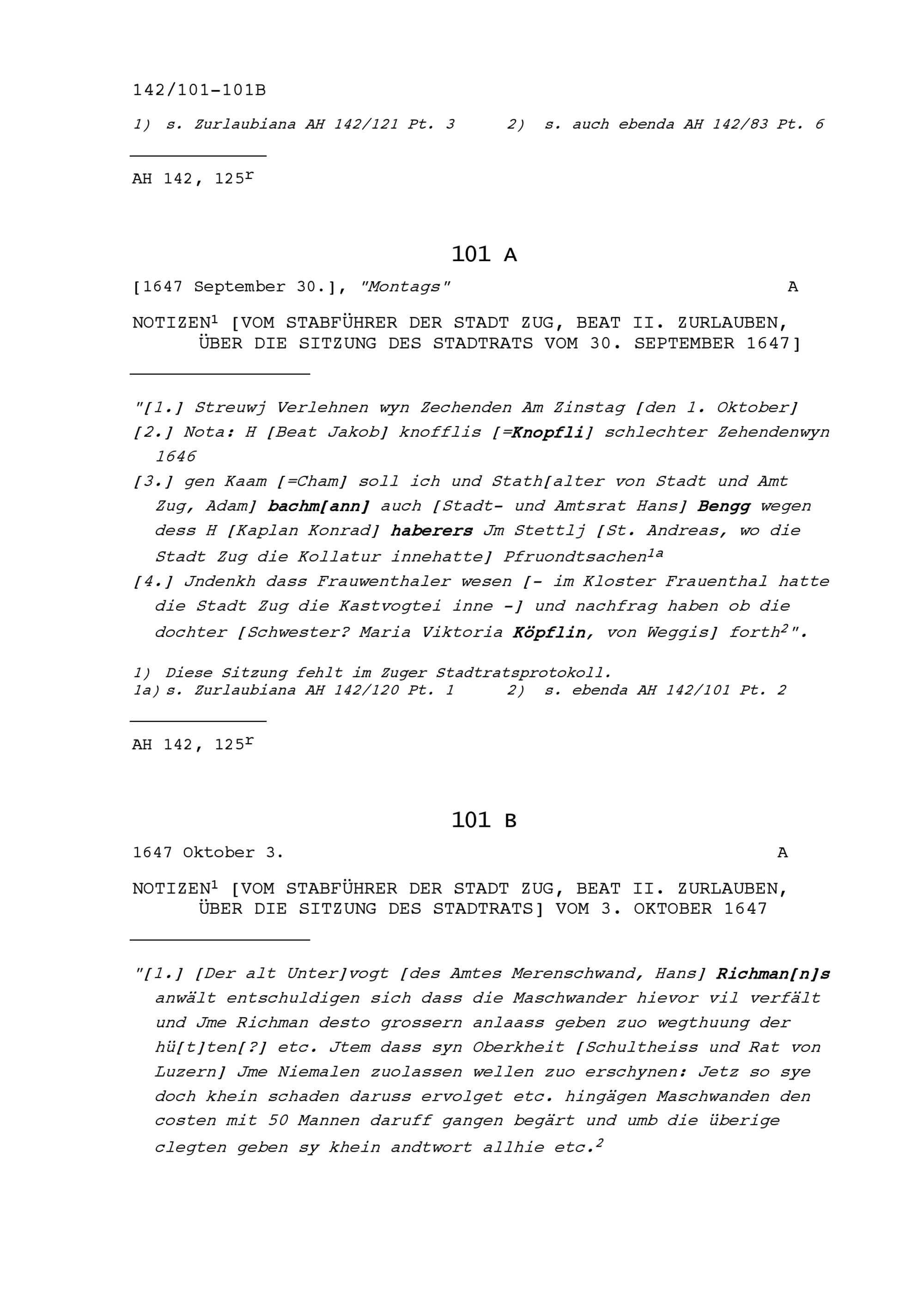 Notiz von Beat II. Zurlauben, Stabführer der Stadt Zug, über die Sitzung des Stadtrats vom 3. Oktober 1647