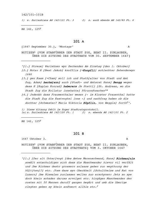 Notiz von Beat II. Zurlauben, Stabführer der Stadt Zug, über die Sitzung des Stadtrats...