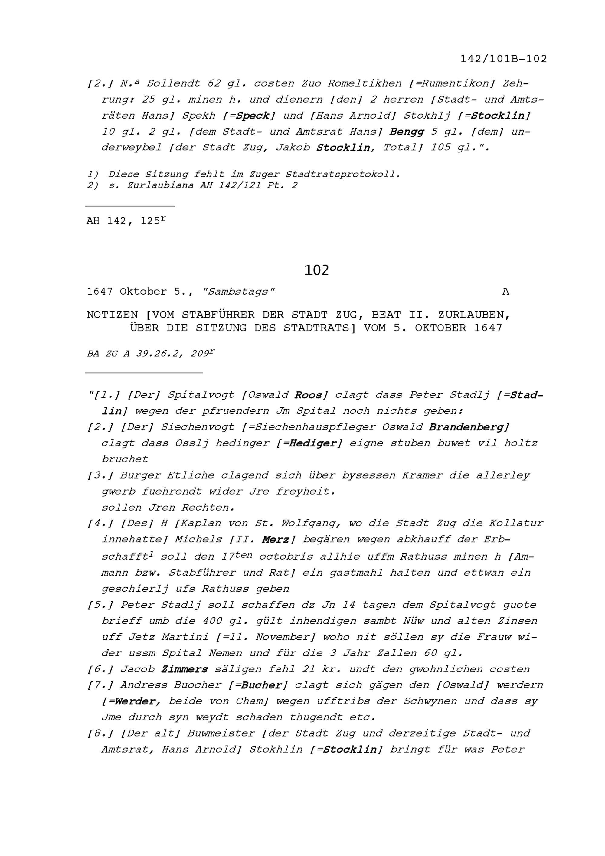 Notiz von Beat II. Zurlauben, Stabführer der Stadt Zug, über die Sitzung des Stadtrats vom 3. Oktober 1647