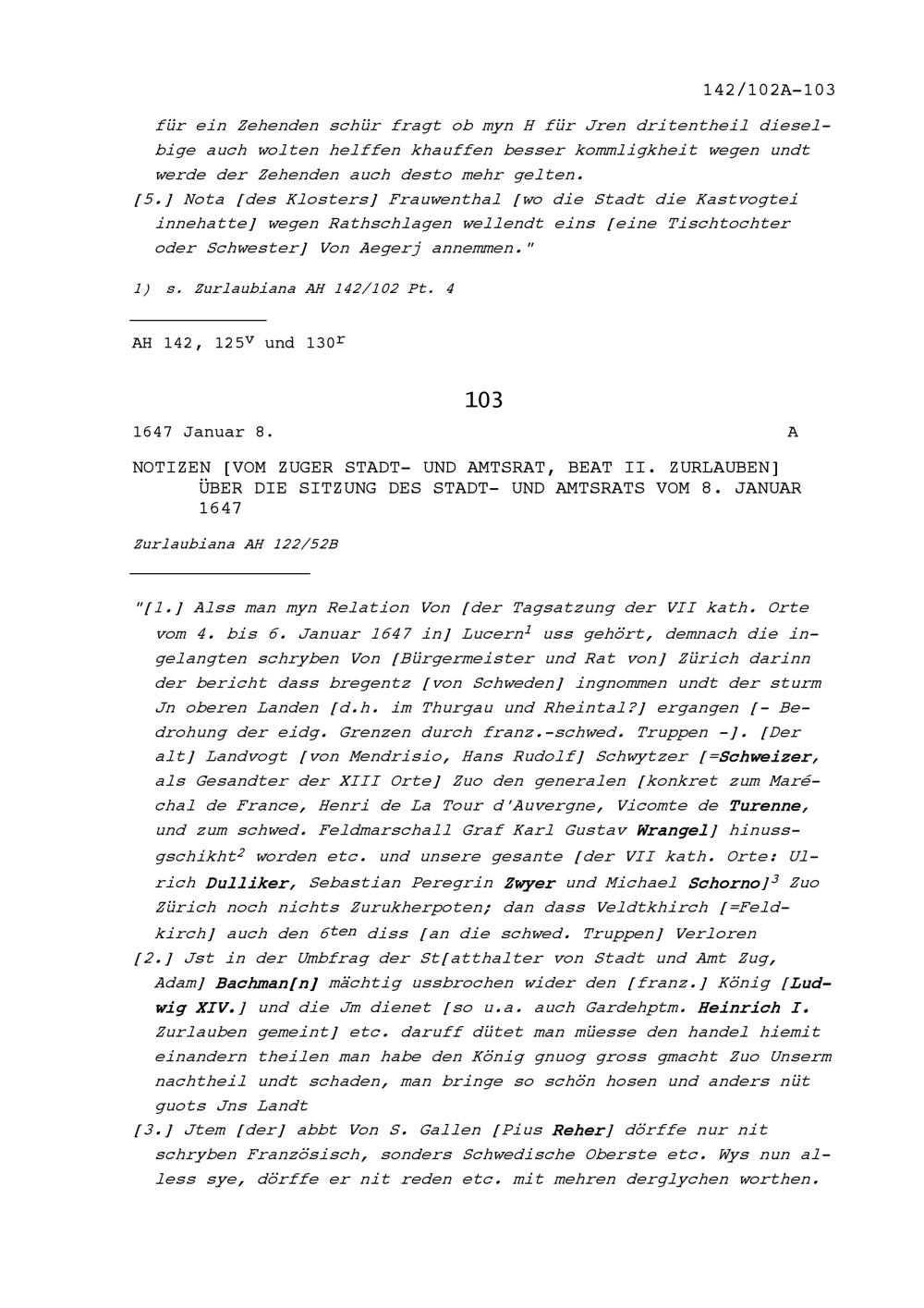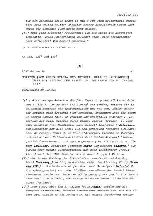 Notiz von Beat II. Zurlauben, Stabführer der Stadt Zug, über die Sitzung des Stadtrats vom 12. Oktober 1647
