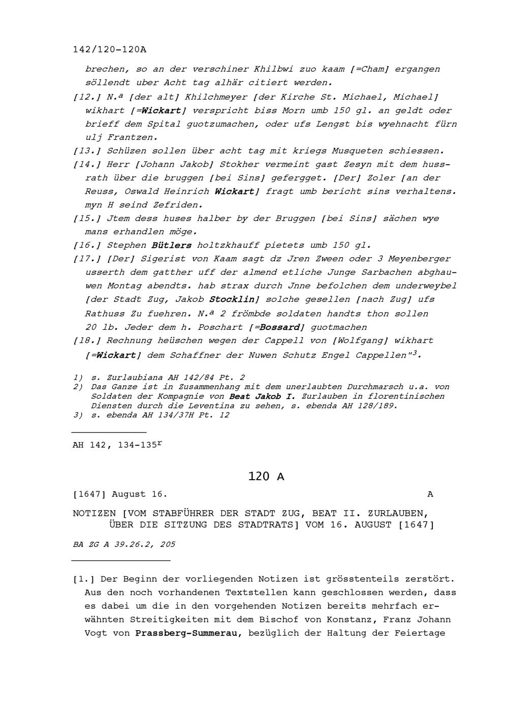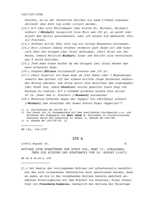 Notiz von Beat II. Zurlauben, Stabführer der Stadt Zug, über die Sitzung des Stadtrats vom 9. August 1647