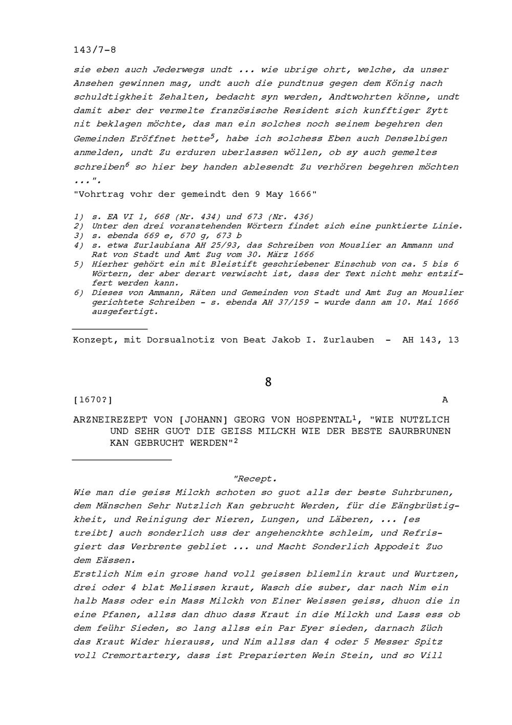 Vortrag von Beat Jakob I. Zurlauben, Stadt- und Amtrat Zug, vor der Gemeindeversammlung...