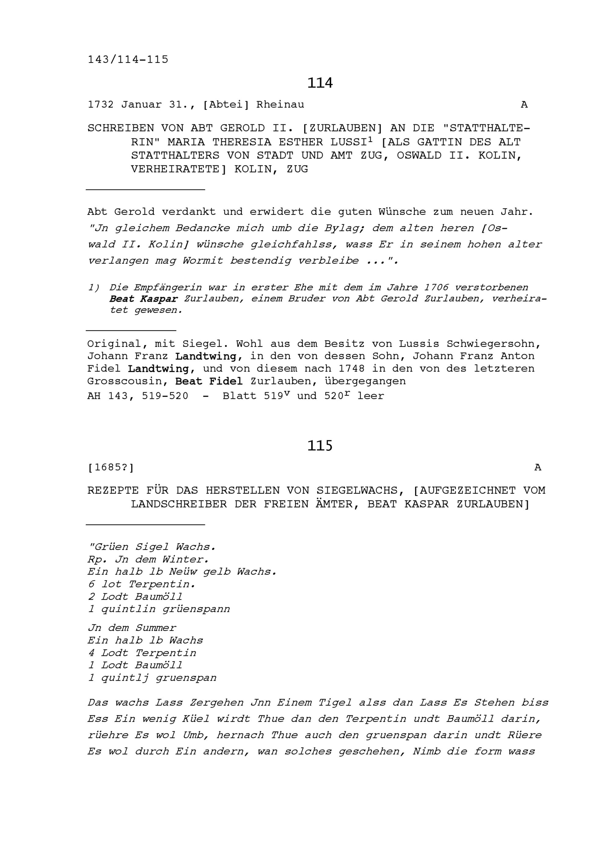 Rezepte für das Herstellen von Siegelwachs, aufgezeichnet von Beat Kaspar Zurlauben, Landschreiber der Freien Ämter