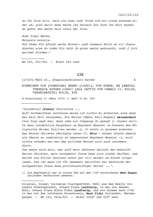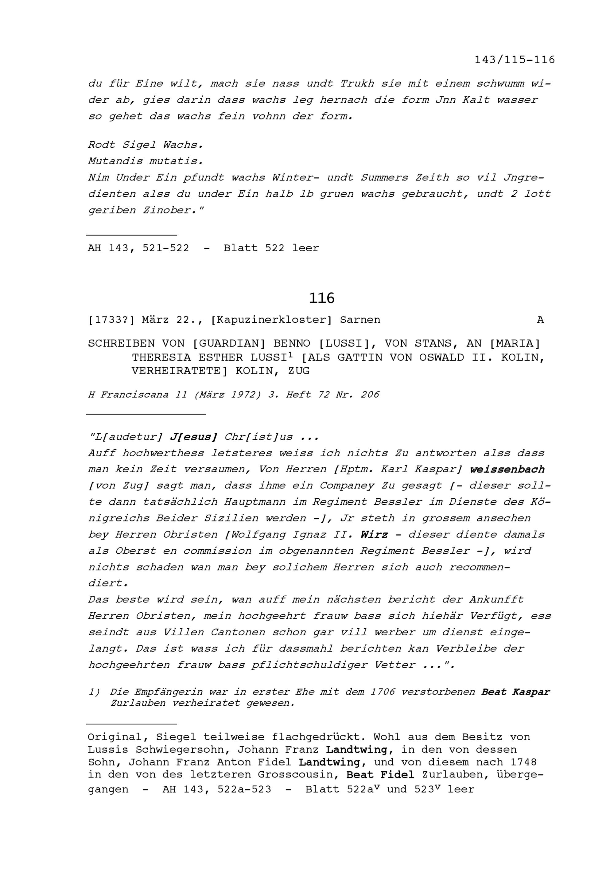 Rezepte für das Herstellen von Siegelwachs, aufgezeichnet von Beat Kaspar Zurlauben, Landschreiber der Freien Ämter