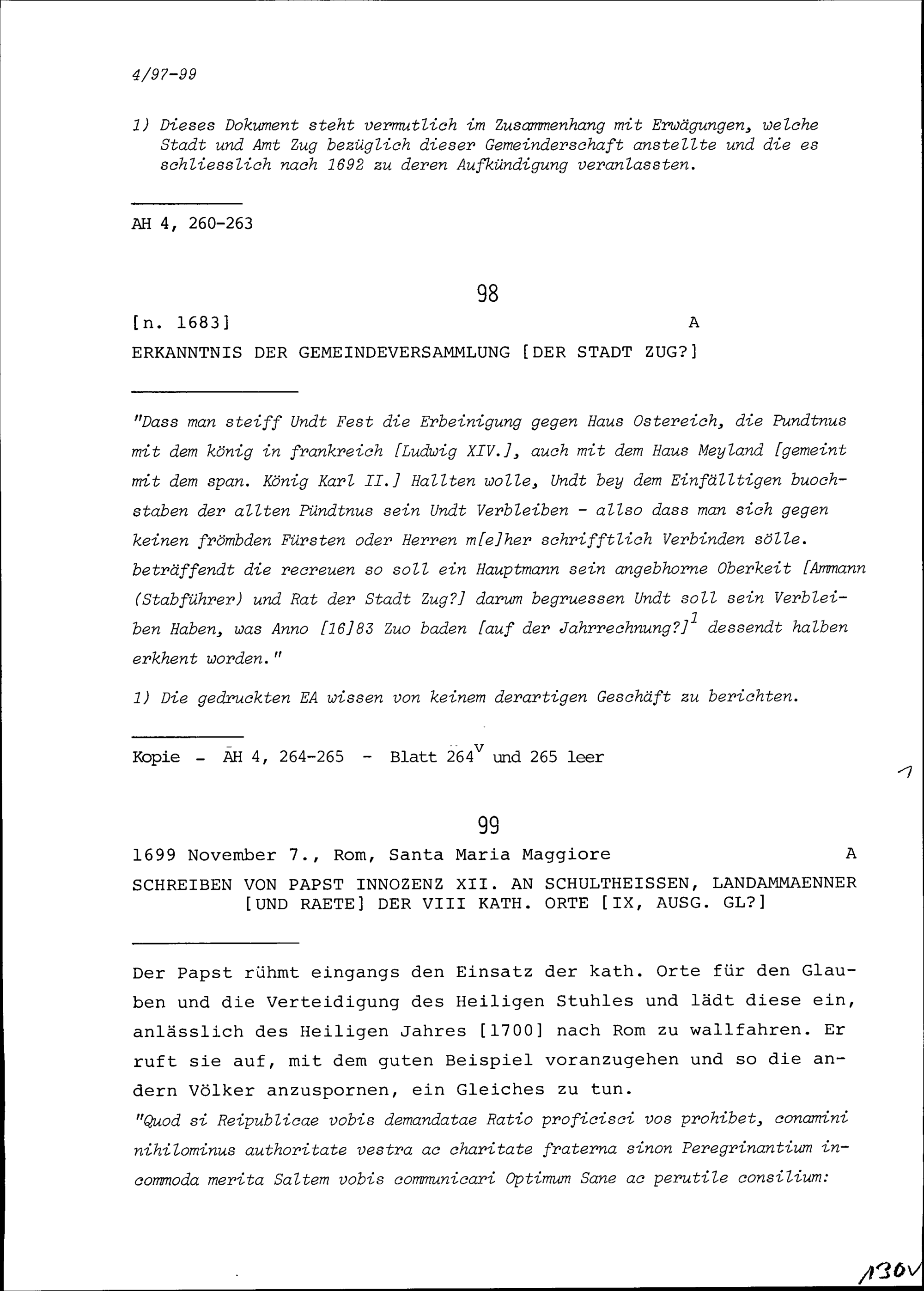 Schreiben von Innozenz XII., Papst, an Schultheissen, Landammänner und Räte der Acht Katholischen Orte