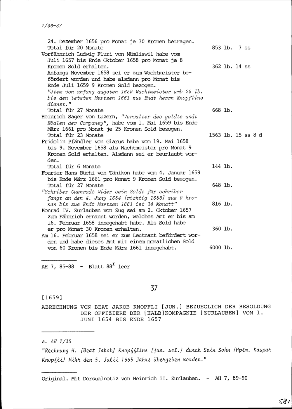 Offiziersetat der Kompanie Zurlauben für die Zeit von 1654 bis 1661, als Beat Jakob Knopfli, Junior, Hauptmann, und Heinrich II. Zurlauben, Hauptmann, obgenannte Kompanie gemeinsam führten
