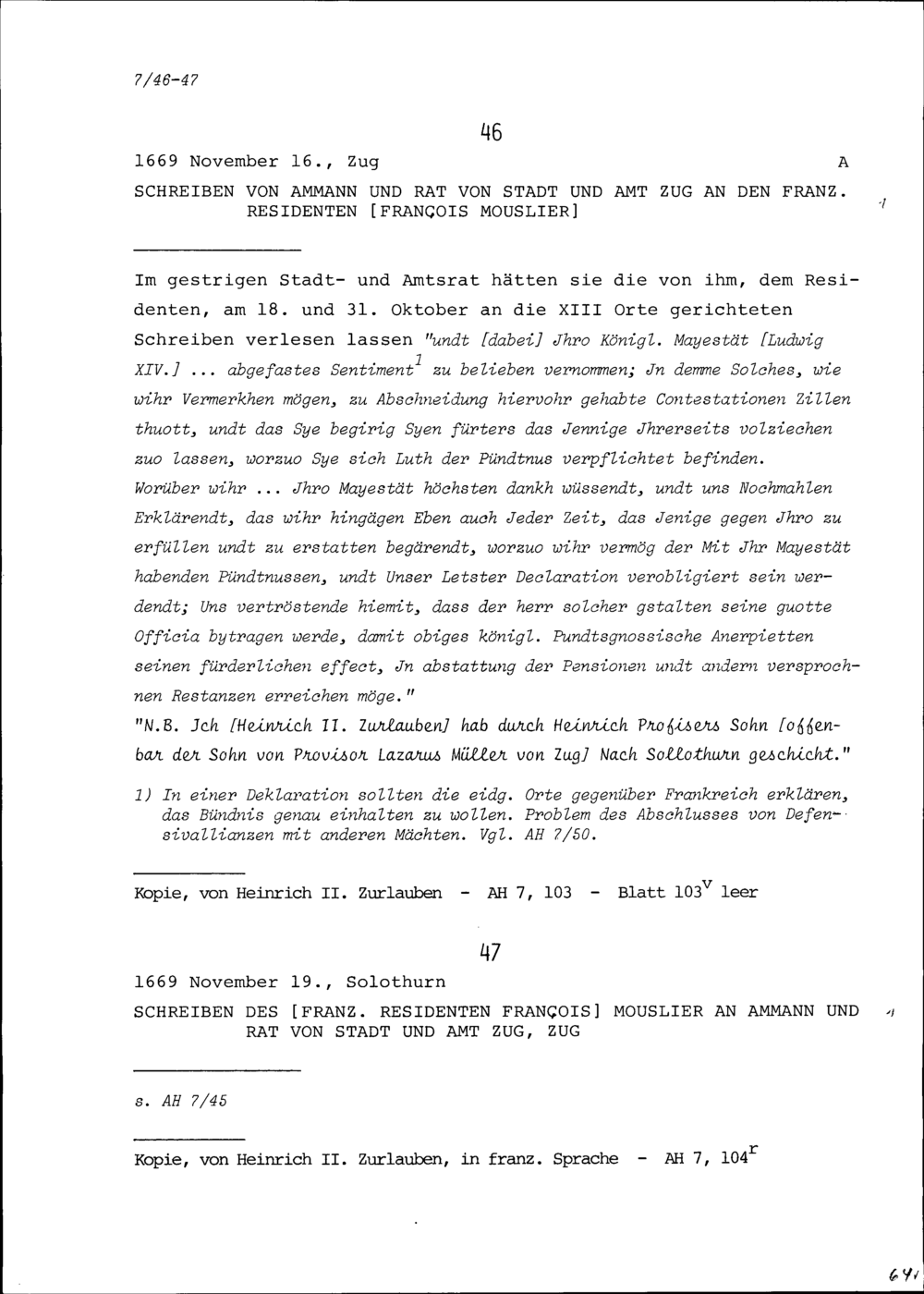 Schreiben von François Mouslier, Resident von Frankreich, an Ammann und Rat von Stadt und Amt Zug, Zug