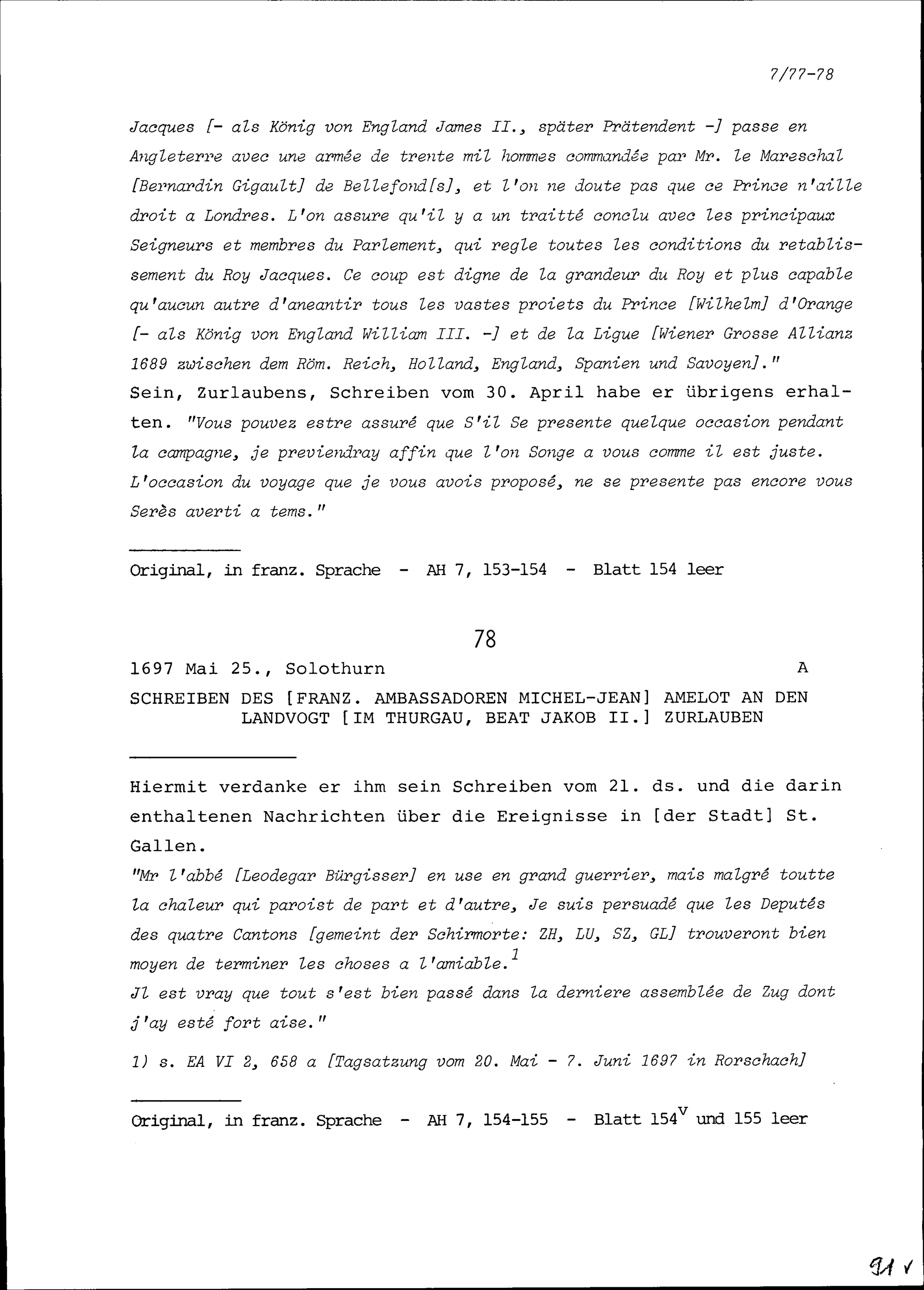 Schreiben von Michel-Jean Amelot, Ambassador von Frankreich, an Beat Jakob II. Zurlauben, Hauptmann