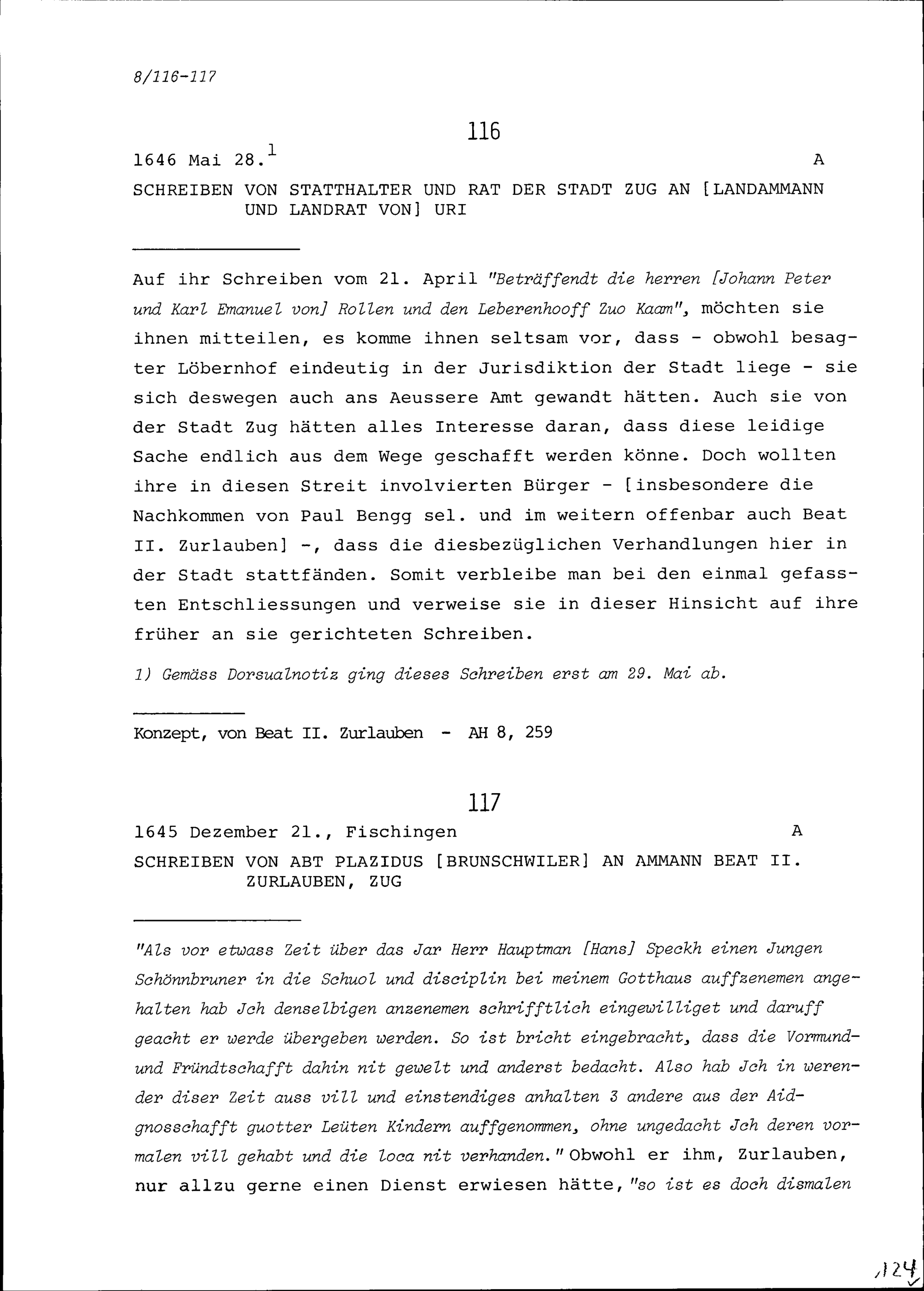 Schreiben von Plazidus Brunschwiler, Abt, an Beat II. Zurlauben, Ammann, Zug