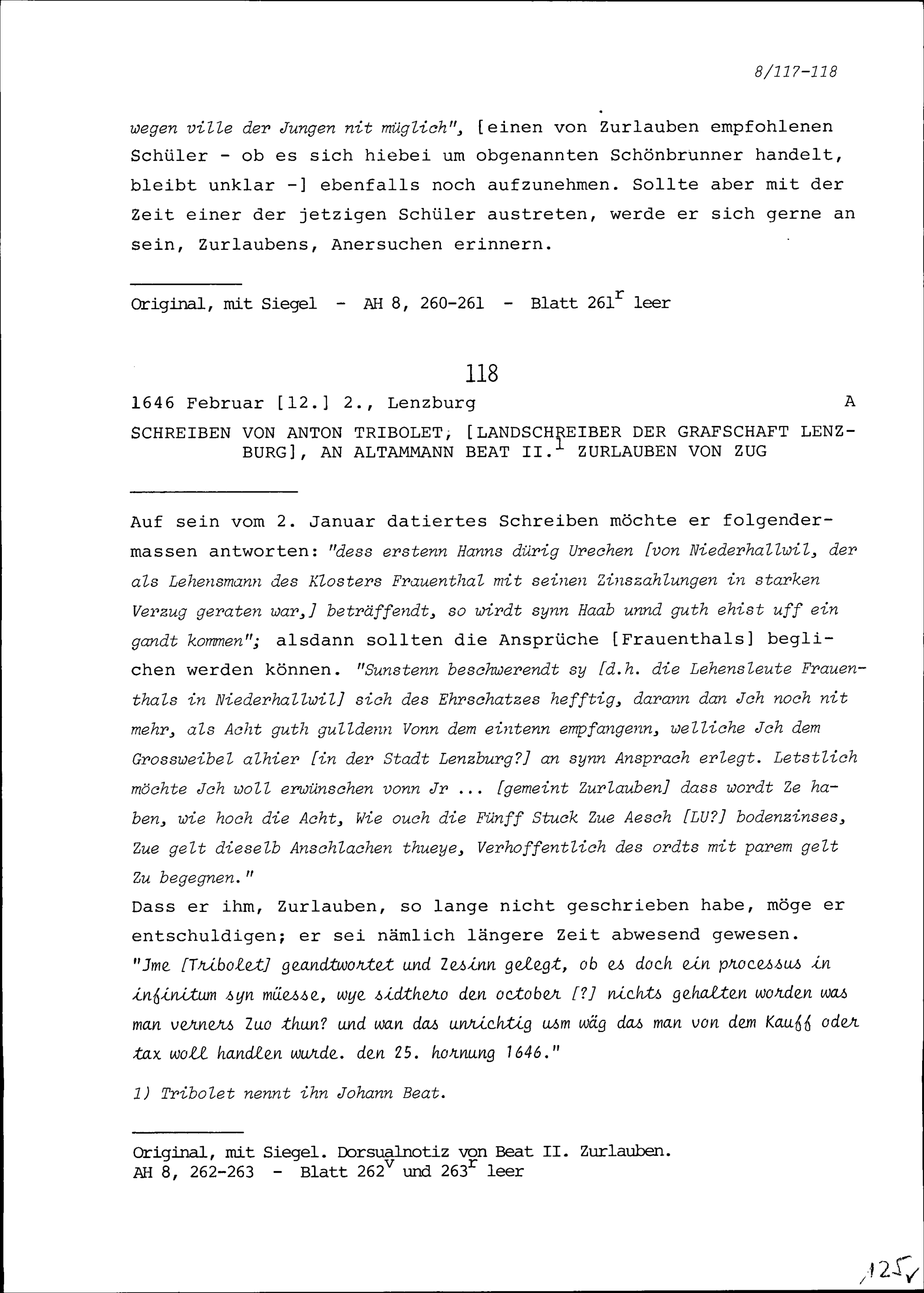 Schreiben von Plazidus Brunschwiler, Abt, an Beat II. Zurlauben, Ammann, Zug