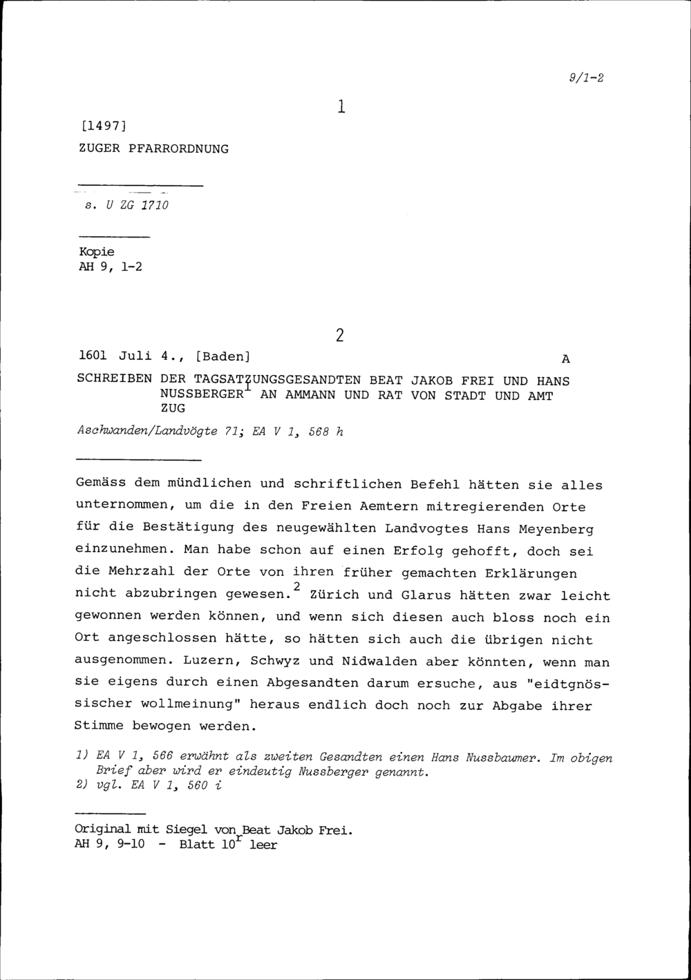 Schreiben von Beat Jakob Frei, Tagsatzungsgesandter, und Hans Nussberger, Tagsatzungsgesandter, an Ammann und Rat von Stadt und Amt Zug