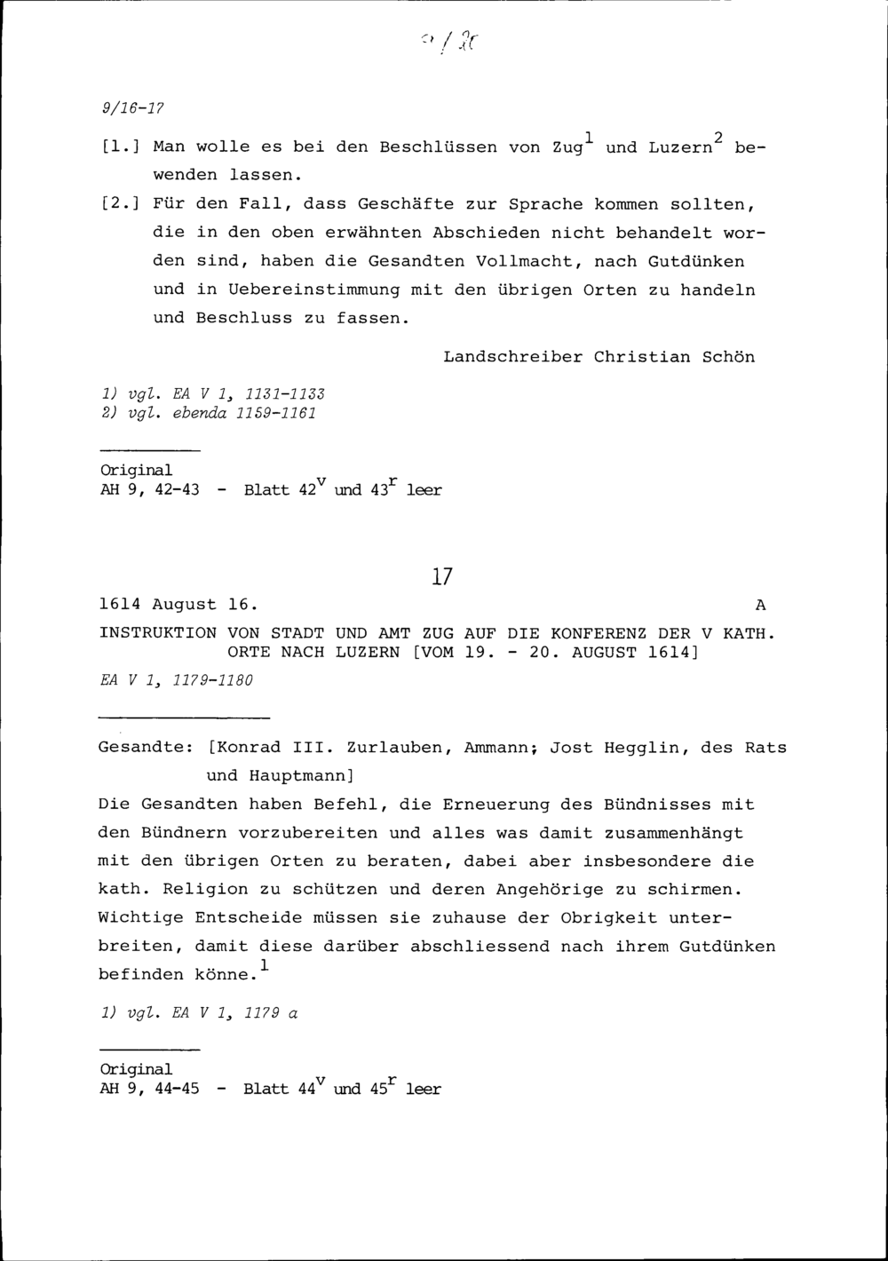 Instruktion von Stadt und Amt Zug auf den Bundesschwur zwischen den Sieben Katholischen Orten und Wallis in Sitten vom 16. bis 18. Mai 1614