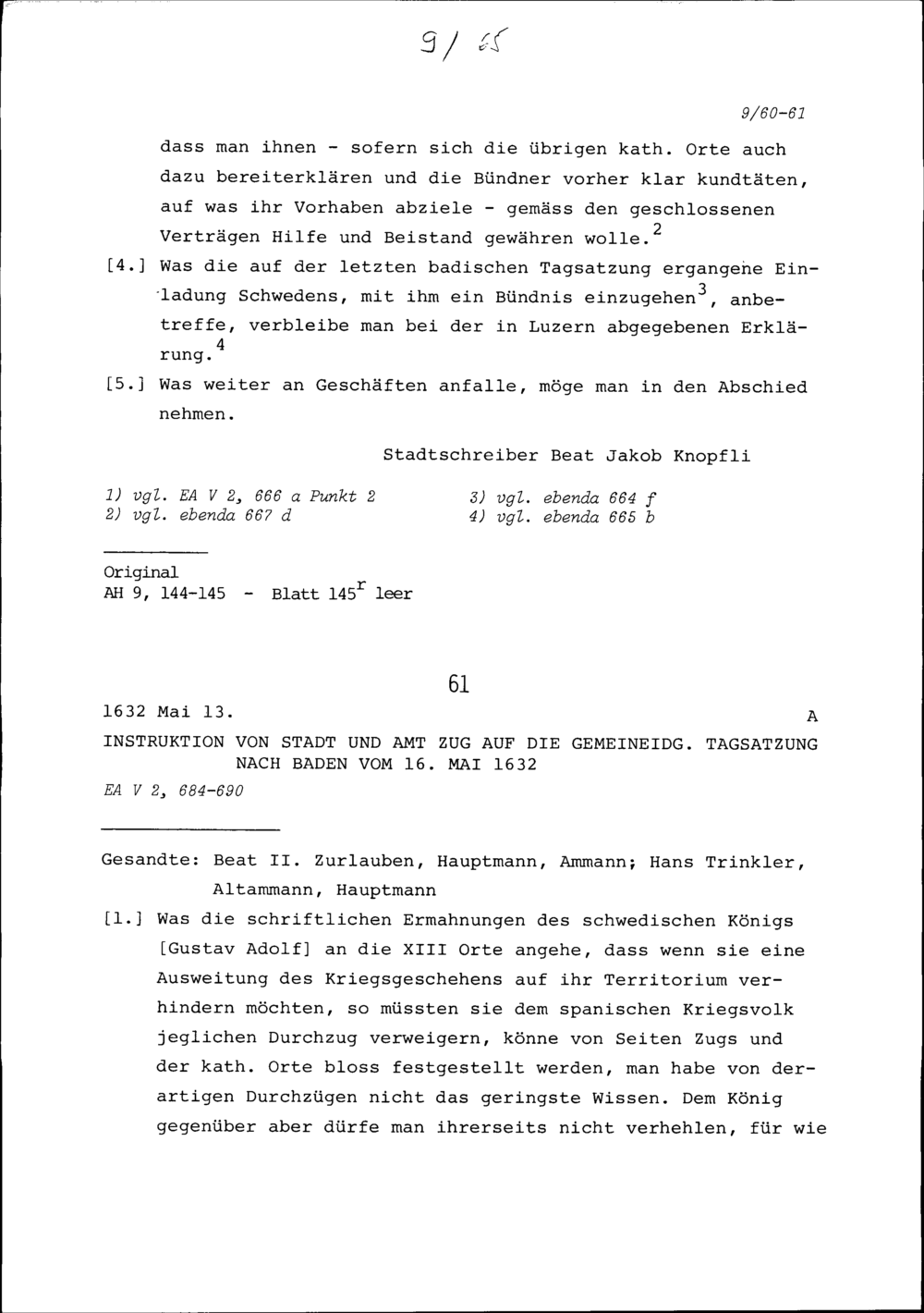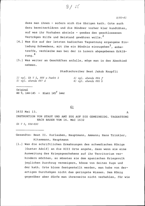 Instruktion von Stadt und Amt Zug auf die Tagsatzung in Baden vom 8. Februar 1632