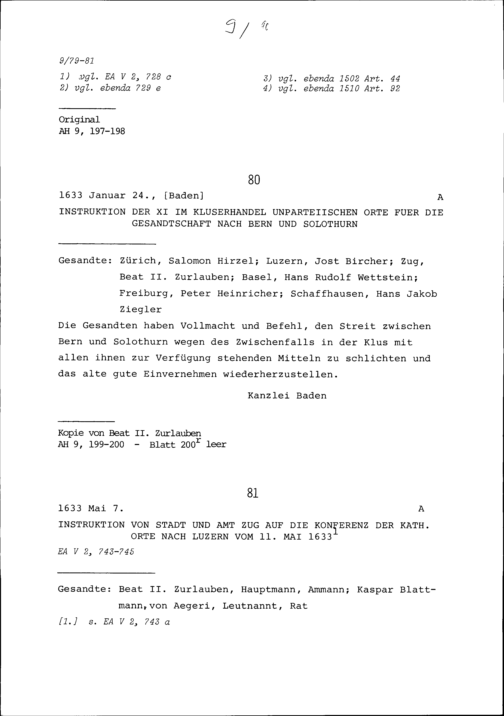 Instruktion von Stadt und Amt Zug auf die Tagsatzung in Baden vom 24. Januar 1633