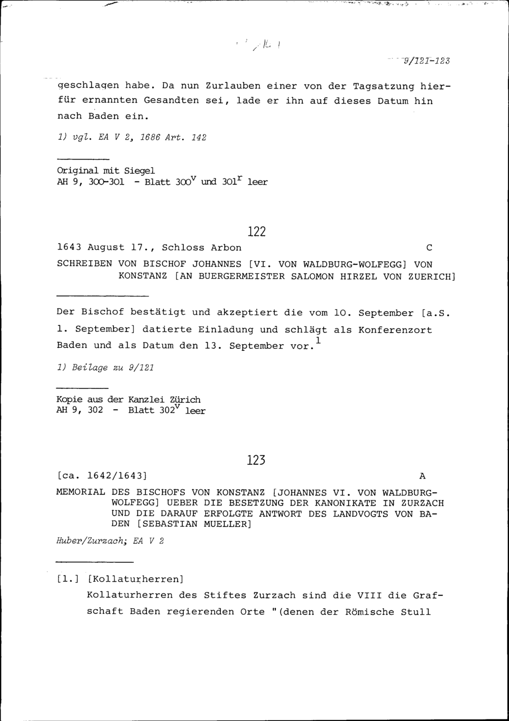 Bericht von Johannes VI. von Waldburg-Wolfegg, Bischof von Konstanz, über die Besetzung der Kanonikate in Zurzach und die darauf erfolgte Antwort von Sebastian Müller, Landvogt von Baden