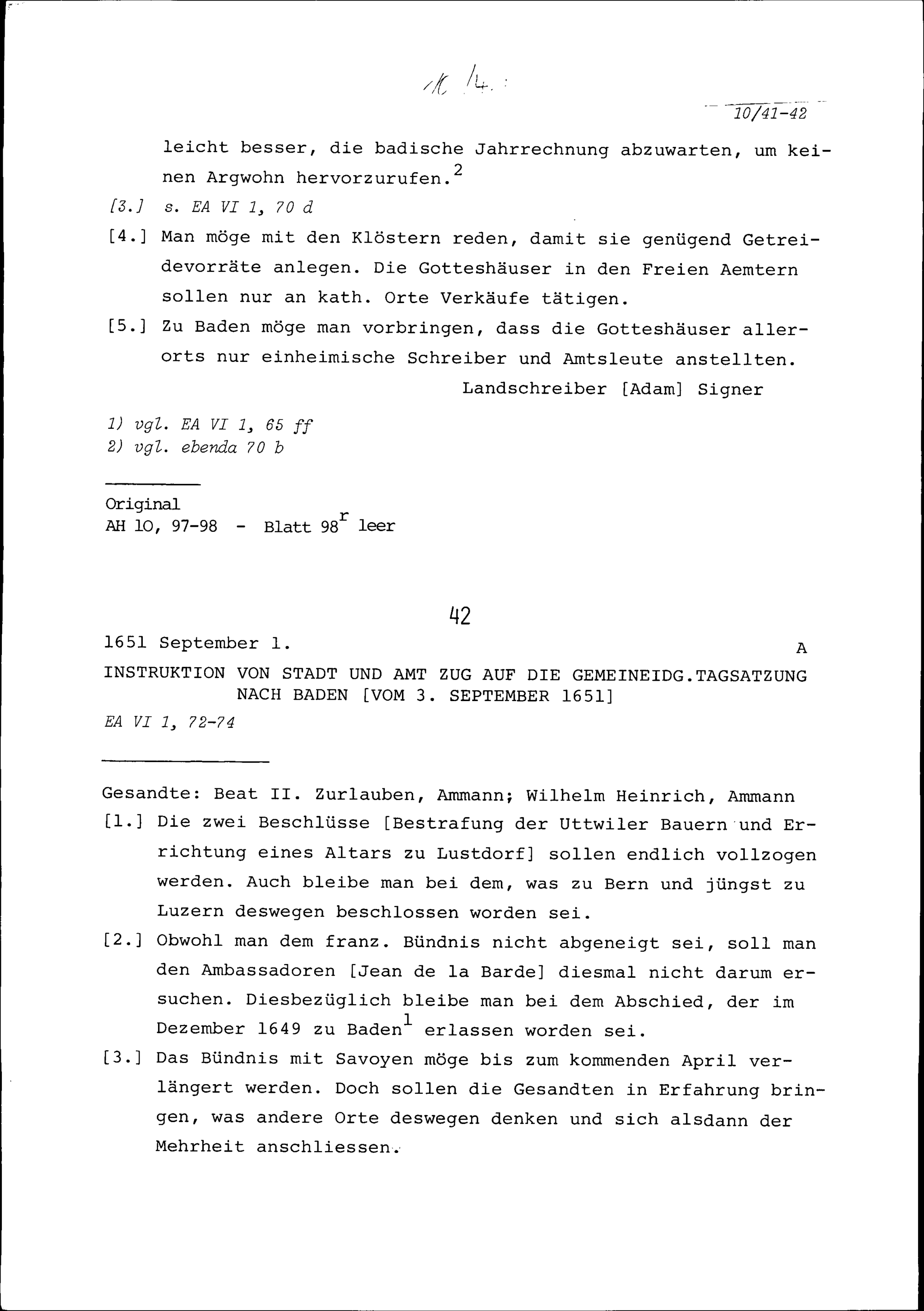 Instruktion von Stadt und Amt Zug auf die Konferenz der Fünf Katholischen Orte in Luzern vom 28. August 1651