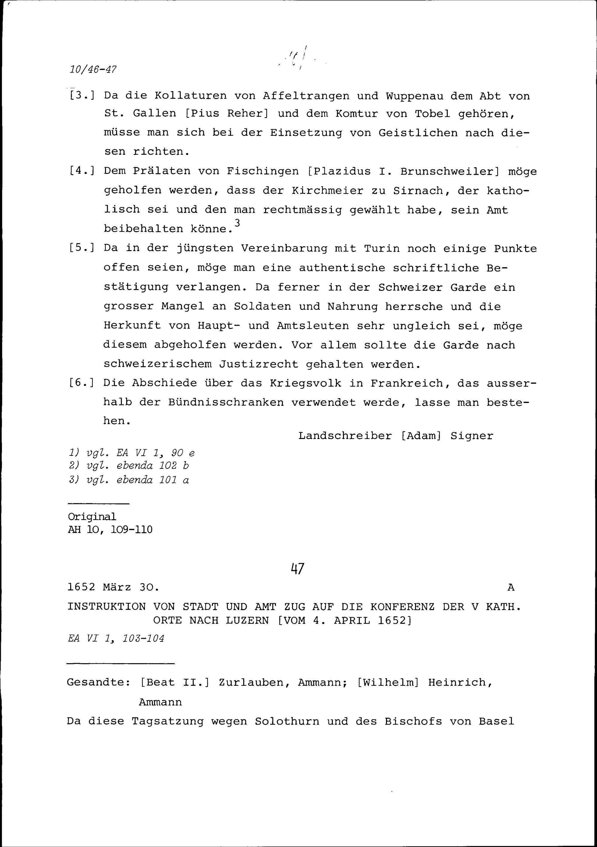 Instruktion von Stadt und Amt Zug auf die Konferenz der Fünf Katholischen Orte in Luzern vom 13. bis 14. März 1652