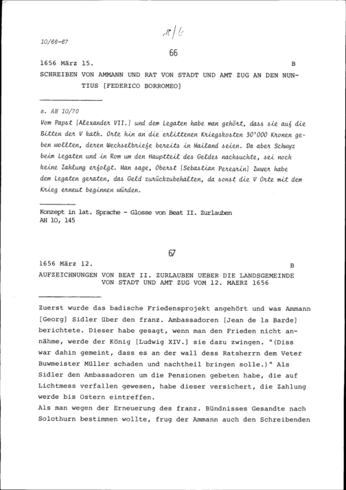 Aufzeichnungen von Beat II. Zurlauben über die Landsgemeinde von Stadt und Amt Zug vom 12. März 1656