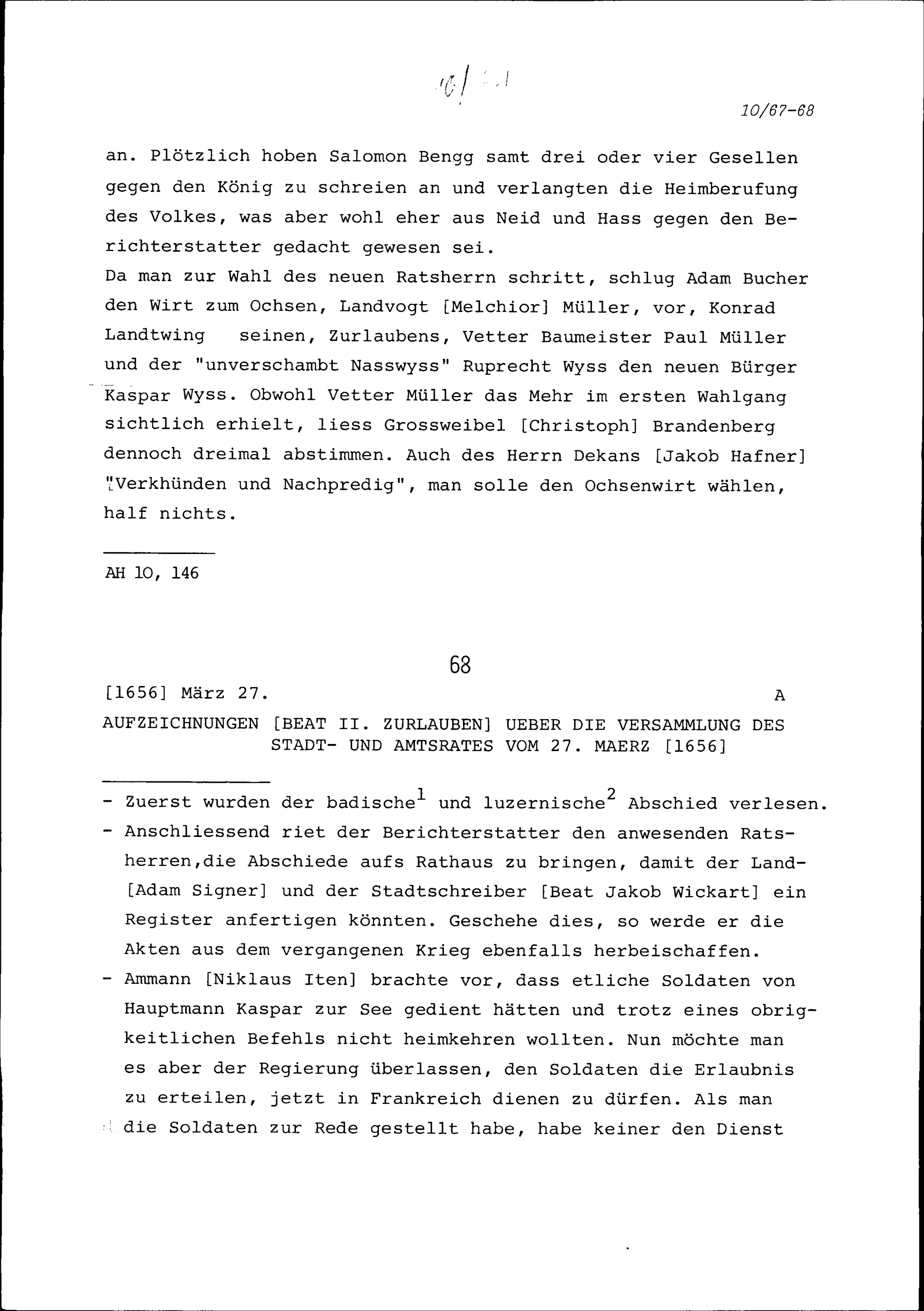 Aufzeichnungen von Beat II. Zurlauben über die Landsgemeinde von Stadt und Amt Zug vom 12. März 1656