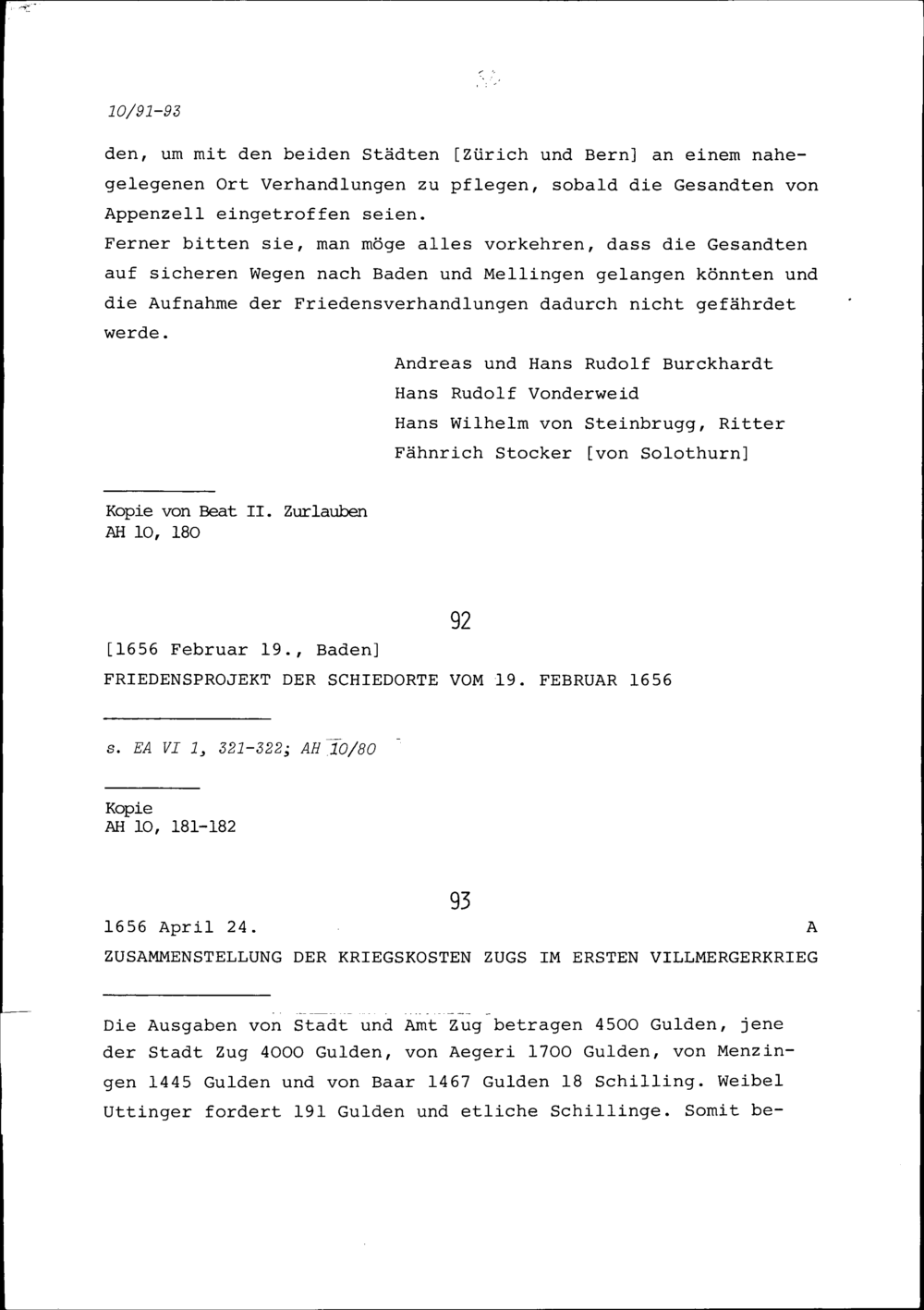 Schreiben der Schiedsorte Basel, Freiburg und Solothurn an die Kriegsräte der Fünf Katholischen Orte in Zug
