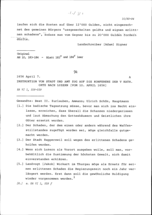 Zusammenstellung der Kriegskosten Zugs im ersten Villmergerkrieg