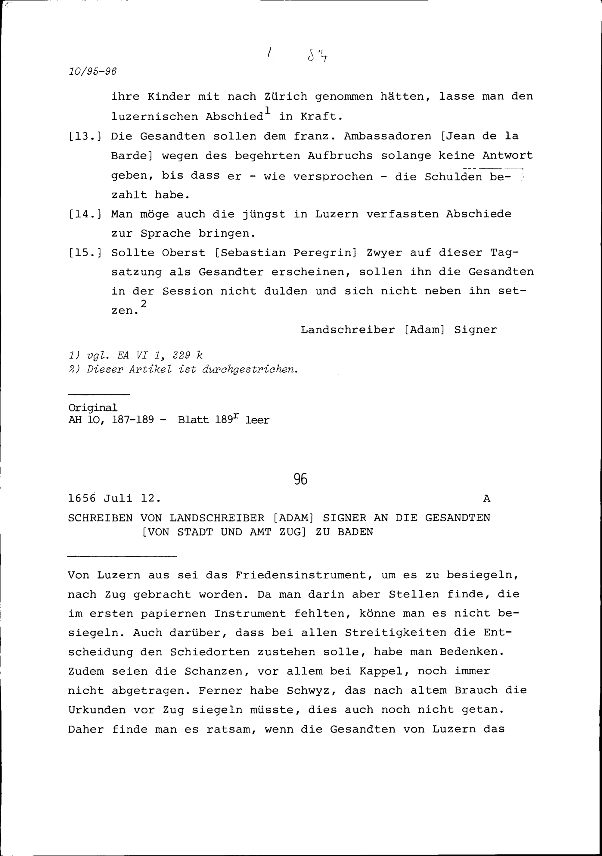 Instruktion von Stadt und Amt Zug für die Verhandlungen der unparteiischen Orte im Streit zwischen Zürich und Bern einerseits und den Fünf Orten anderseits in Baden vom 19. April bis 14. Juni 1656