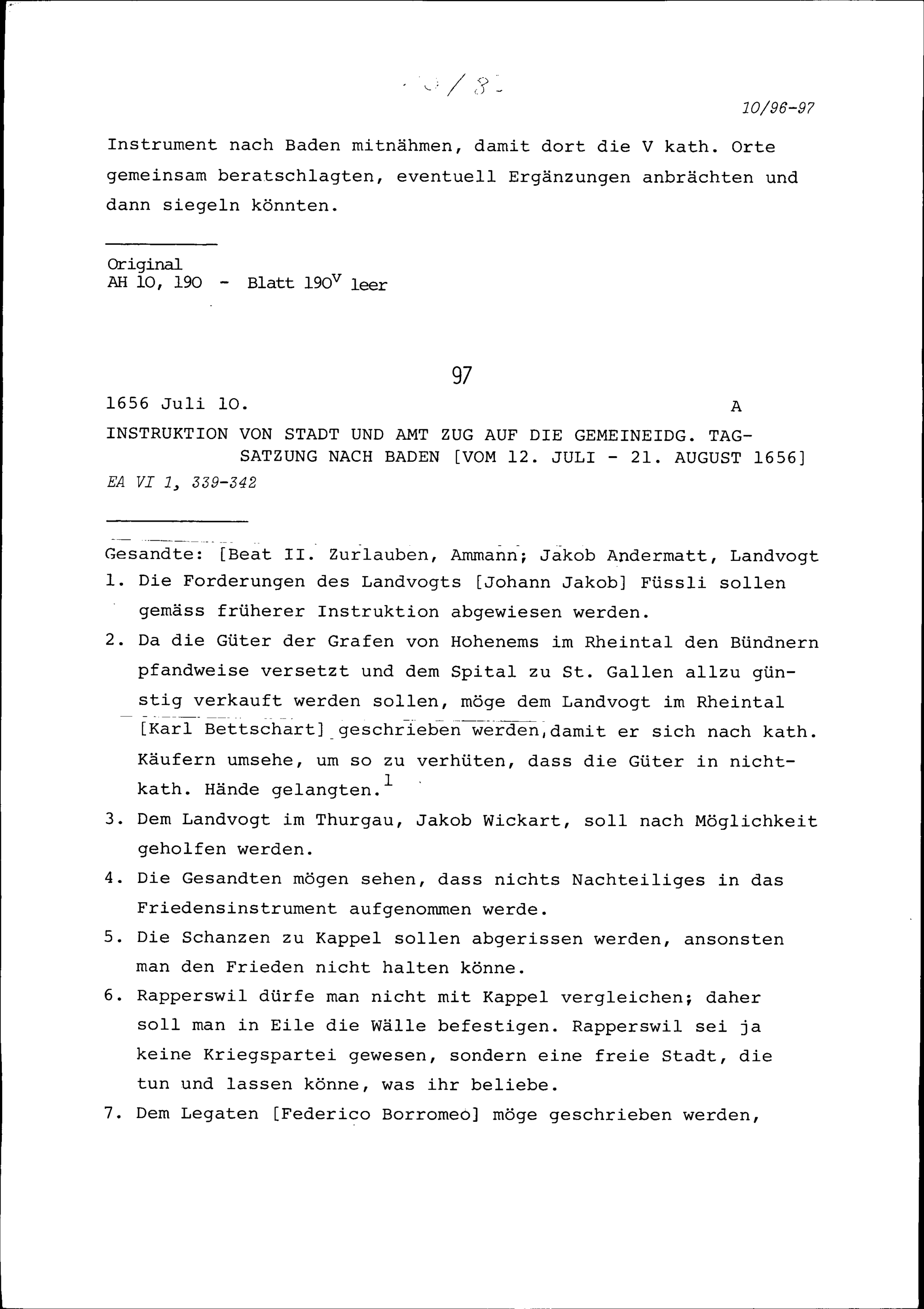 Schreiben von Adam Signer, Landschreiber, an die Gesandten von Stadt und Amt Zug in Baden