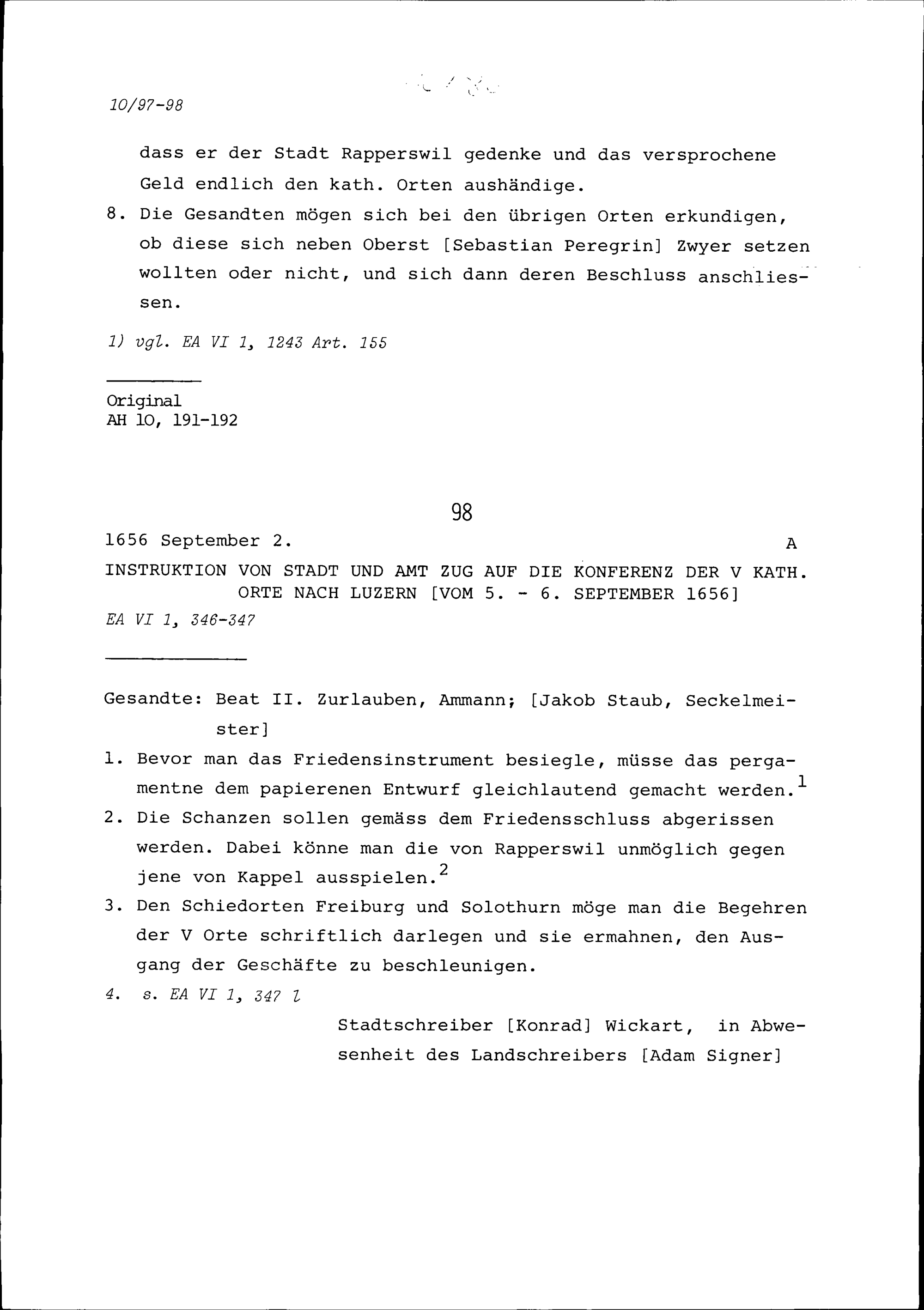 Instruktion von Stadt und Amt Zug auf die Tagsatzung in Baden vom 12. Juli bis 21. August 1656