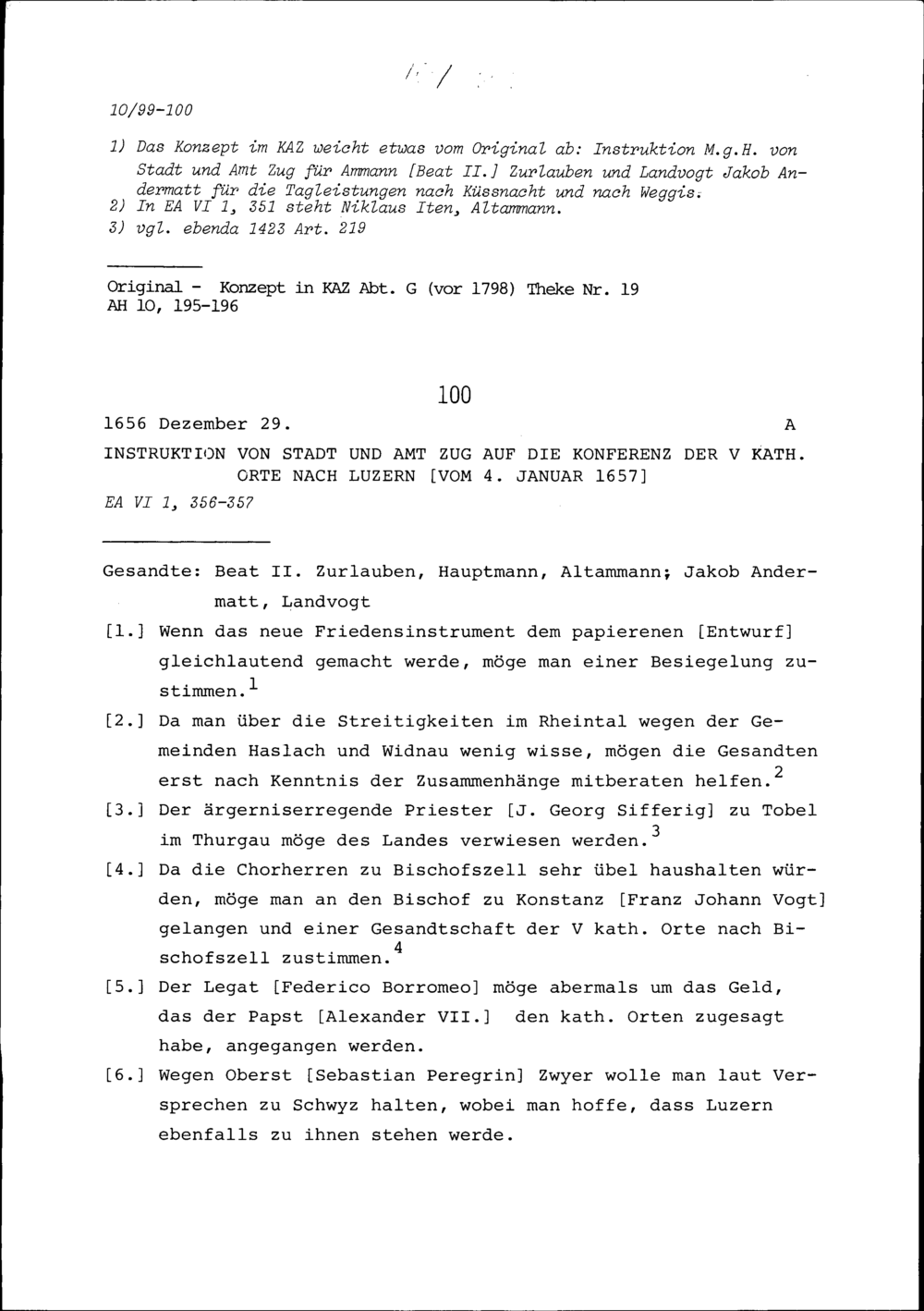 Instruktion von Stadt und Amt Zug auf die Konferenz der Fünf Katholischen Orte in Weggis vom 7. Oktober 1656
